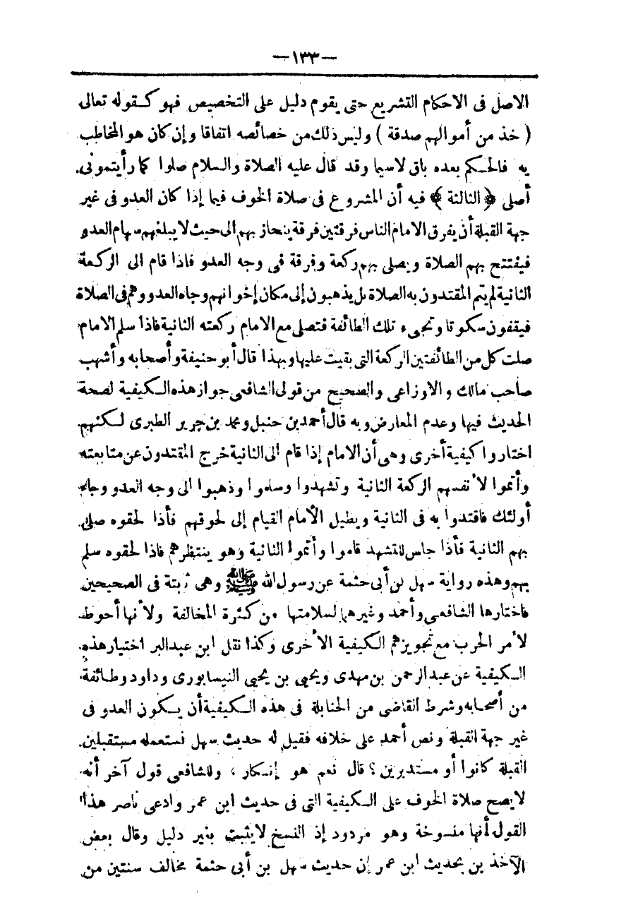 وَهَذِهِ رِوَايَةُ سَهْلِ بْنِ أَبِي حَثْمَةَ عَنْ رَسُولِ اللَّهِ - صَلَّى اللَّهُ عَلَيْهِ وَسَلَّمَ - وَهِيَ ثَابِتَةٌ فِي الصَّحِيحَيْنِ فَاخْتَارَهَا الشَّافِعِيُّ وَأَحْمَدُ وَغَيْرُهُمَا لِسَلَامَتِهَا مِنْ كَثْرَةِ الْمُخَالَفَةِ وَلِأَنَّهَا أَحْوَطُ لِأَمْرِ الْحَرْبِ مَعَ تَجْوِيزِهِمْ الْكَيْفِيَّةَ الْأُخْرَى وَكَذَا نَقَلَ ابْنُ عَبْدِ الْبَرِّ اخْتِيَارَ هَذِهِ الْكَيْفِيَّةِ عَنْ عَبْدِ الرَّحْمَنِ بْنِ مَهْدِيٍّ وَيَحْيَى بْنِ يَحْيَى النَّيْسَابُورِيِّ وَدَاوُد وَطَائِفَةٍ مِنْ أَصْحَابِهِ وَشَرَطَ الْقَاضِي مِنْ الْحَنَابِلَةِ فِي هَذِهِ الْكَيْفِيَّةِ أَنْ يَكُونَ الْعَدُوُّ فِي غَيْرِ جِهَةِ الْقِبْلَةِ.