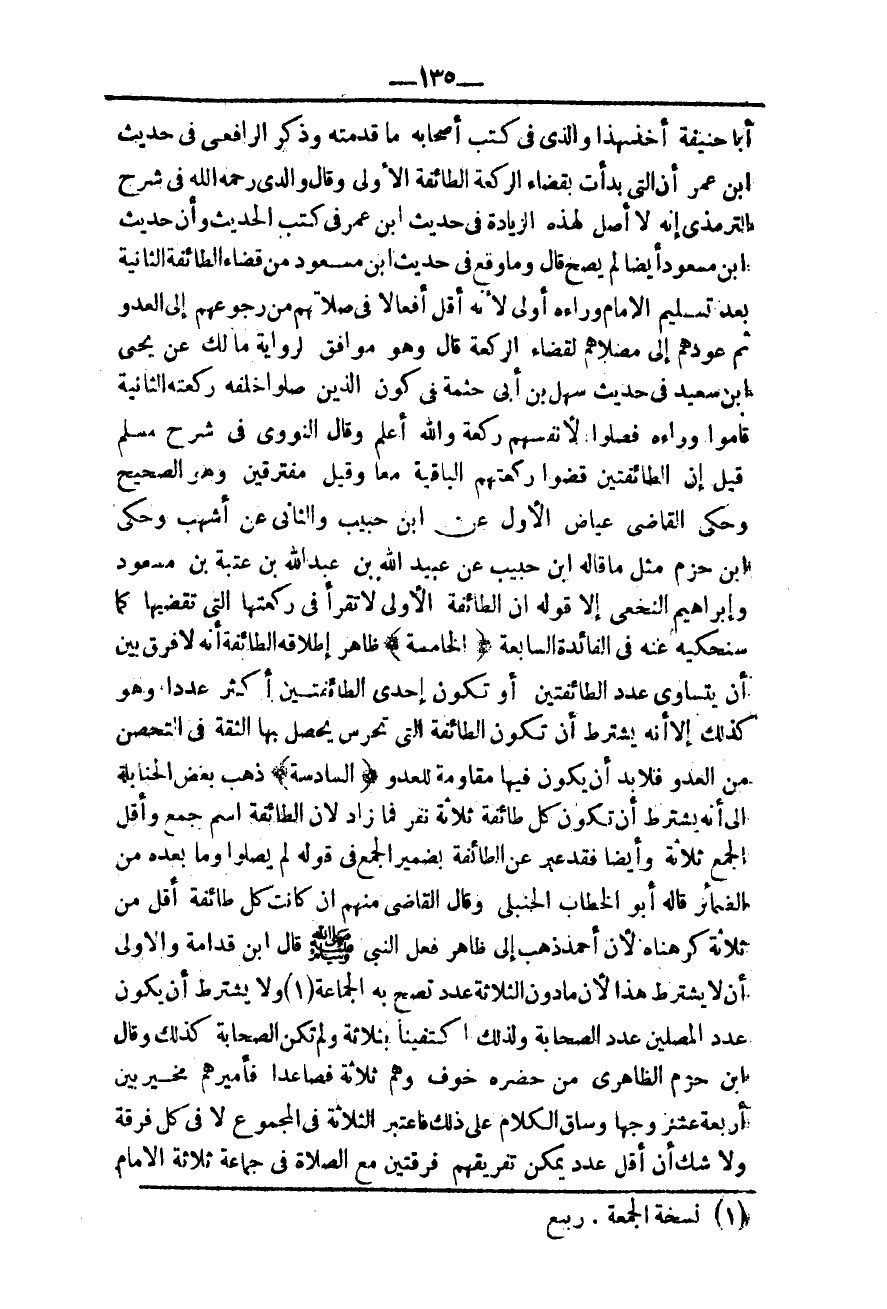 ـــــــــــــــــــــــــــــQأَبَا حَنِيفَةَ أَخَذَ بِهَذَا وَاَلَّذِي فِي كُتُبِ أَصْحَابِهِ مَا قَدَّمْته وَذَكَرَ الرَّافِعِيُّ فِي حَدِيثِ ابْنِ عُمَرَ أَنَّ الَّتِي بَدَأَتْ بِقَضَاءِ الرَّكْعَةِ الطَّائِفَةُ الْأُولَى وَقَالَ وَالِدِي - رَحِمَهُ اللَّهُ - فِي شَرْحِ التِّرْمِذِيِّ إنَّهُ لَا أَصْلَ لِهَذِهِ الزِّيَادَةِ فِي حَدِيثِ ابْنِ عُمَرَ فِي كُتُبِ الْحَدِيثِ وَأَنَّ حَدِيثَ ابْنِ مَسْعُودٍ أَيْضًا لَمْ يَصِحَّ قَالَ وَمَا وَقَعَ فِي حَدِيثِ ابْنِ مَسْعُودٍ مِنْ قَضَاءِ الطَّائِفَةِ الثَّانِيَةِ بَعْدَ تَسْلِيمِ الْإِمَامِ وَرَاءَهُ أَوْلَى لِأَنَّهُ أَقَلُّ أَفْعَالًا فِي صَلَاتِهِمْ مِنْ رُجُوعِهِمْ إلَى الْعَدُوِّ ثُمَّ عَوْدِهِمْ إلَى مُصَلَّاهُمْ لِقَضَاءِ الرَّكْعَةِ.