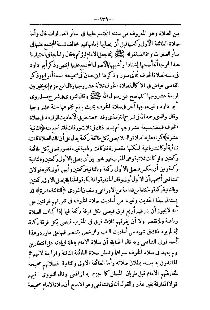 قَالَ وَالْحُجَّةُ فِي اخْتِيَارِنَا هَذَا الْوَجْهَ أَنَّهُ أَصَحُّهَا إسْنَادًا وَأَشْبَهُهَا بِالْأُصُولِ الْمُجْتَمَعِ عَلَيْهَا انْتَهَى وَذَكَرَ أَبُو دَاوُد فِي سُنَنِهِ لِصَلَاةِ الْخَوْفِ ثَمَانِي صُوَرٍ وَذَكَرَهَا ابْنُ حِبَّانَ فِي صَحِيحِهِ تِسْعَةَ أَنْوَاعٍ وَذَكَرَ الْقَاضِي عِيَاضٌ فِي الْإِكْمَالِ لِصَلَاةِ الْخَوْفِ ثَلَاثَةَ عَشَرَ وَجْهًا وَقَالَ ابْنُ حَزْمٍ إنَّهُ يُخَيَّرُ بَيْنَ أَرْبَعَةَ عَشَرَ وَجْهًا كُلُّهَا صَحَّ عَنْ رَسُولِ اللَّهِ - صَلَّى اللَّهُ عَلَيْهِ وَسَلَّمَ - وَقَالَ النَّوَوِيُّ فِي شَرْحِ مُسْلِمٍ.