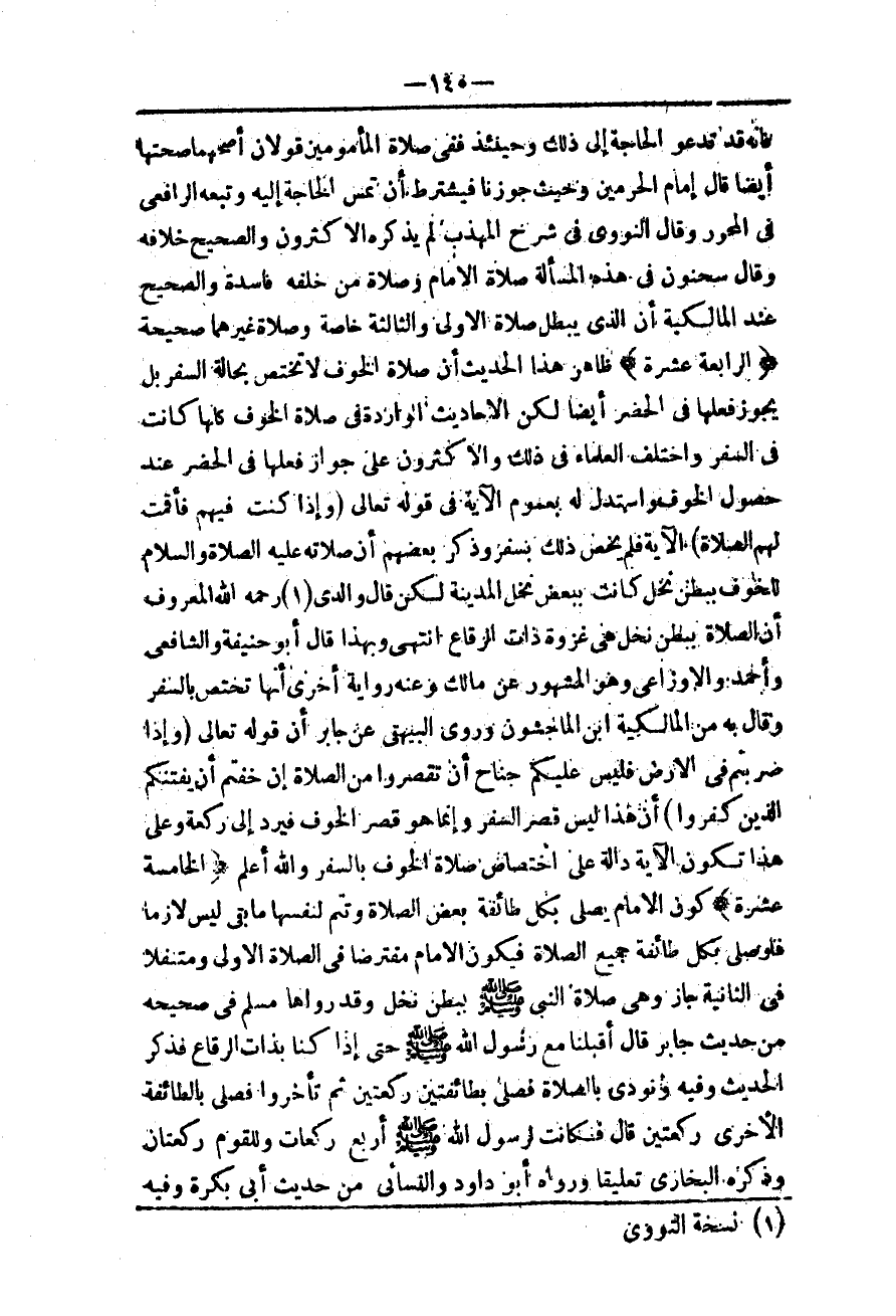 (الرَّابِعَةَ عَشْرَةَ) ظَاهِرُ هَذَا الْحَدِيثِ أَنَّ صَلَاةَ الْخَوْفِ لَا تَخْتَصُّ بِحَالَةِ السَّفَرِ بَلْ يَجُوزُ فِعْلُهَا فِي الْحَضَرِ أَيْضًا لَكِنَّ الْأَحَادِيثَ الْوَارِدَةَ فِي صَلَاةِ الْخَوْفِ كُلَّهَا كَانَتْ فِي السَّفَرِ وَاخْتَلَفَ الْعُلَمَاءُ فِي ذَلِكَ وَالْأَكْثَرُونَ عَلَى جَوَازِ فِعْلِهَا فِي الْحَضَرِ عِنْدَ حُصُولِ الْخَوْفِ وَاسْتُدِلَّ لَهُ بِعُمُومِ الْآيَةِ فِي قَوْله تَعَالَى {وَإِذَا كُنْتَ فِيهِمْ فَأَقَمْتَ لَهُمُ الصَّلاةَ} [النساء: 102] الْآيَةَ فَلَمْ يَخُصَّ ذَلِكَ بِسَفَرٍ وَذَكَرَ بَعْضُهُمْ أَنَّ صَلَاتَهُ - عَلَيْهِ الصَّلَاةُ وَالسَّلَامُ - لِلْخَوْفِ بِبَطْنِ نَخْلٍ كَانَتْ بِبَعْضِ نَخْلِ الْمَدِينَةِ لَكِنْ قَالَ وَالِدِي - رَحِمَهُ اللَّهُ - الْمَعْرُوفُ أَنَّ الصَّلَاةَ بِبَطْنِ نَخْلٍ هِيَ غَزْوَةُ ذَاتِ الرِّقَاعِ انْتَهَى وَبِهَذَا قَالَ أَبُو حَنِيفَةَ وَالشَّافِعِيُّ وَأَحْمَدُ وَالْأَوْزَاعِيُّ وَهُوَ الْمَشْهُورُ عَنْ مَالِكٍ وَعَنْهُ رِوَايَةٌ أُخْرَى أَنَّهَا تَخْتَصُّ بِالسَّفَرِ وَقَالَ بِهِ مِنْ الْمَالِكِيَّةِ ابْنُ الْمَاجِشُونِ وَرَوَى الْبَيْهَقِيُّ عَنْ جَابِرٍ أَنَّ قَوْله تَعَالَى {وَإِذَا ضَرَبْتُمْ فِي الأَرْضِ فَلَيْسَ عَلَيْكُمْ جُنَاحٌ أَنْ تَقْصُرُوا مِنَ الصَّلاةِ إِنْ خِفْتُمْ أَنْ يَفْتِنَكُمُ الَّذِينَ كَفَرُوا} [النساء: 101] إنَّ هَذَا لَيْسَ قَصْرُ السَّفَرِ وَإِنَّمَا هُوَ قَصْرُ الْخَوْفِ فَيُرَدُّ إلَى رَكْعَةٍ وَعَلَى هَذَا تَكُونُ الْآيَةُ دَالَّةً عَلَى اخْتِصَاصِ صَلَاةِ الْخَوْفِ بِالسَّفَرِ وَاَللَّهُ أَعْلَمُ.