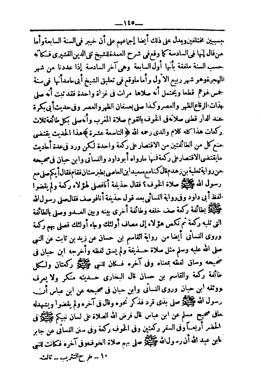ـــــــــــــــــــــــــــــQبِسَبَبَيْنِ مُخْتَلِفَيْنِ وَيَدُلُّ عَلَى ذَلِكَ أَيْضًا إجْمَاعُهُمْ عَلَى أَنَّ خَيْبَرَ فِي السَّنَةِ السَّابِعَةِ وَأَمَّا مَنْ قَالَ إنَّهَا فِي السَّادِسَةِ كَمَا وَقَعَ فِي شَرْحِ الْعُمْدَةِ لِلشَّيْخِ تَقِيِّ الدِّينِ الْقُشَيْرِيِّ فَكَأَنَّهُ حَسَبَ السَّنَةِ مُلَفَّقَةٌ بِأَنَّهَا أَوَّلُ السَّابِعَةِ وَهِيَ آخِرُ السَّادِسَةِ إذَا عَدَدْنَا مِنْ شَهْرِ الْهِجْرَةِ وَهُوَ شَهْرُ رَبِيعٍ الْأَوَّلِ وَأَمَّا مَا وَقَعَ فِي تَعْلِيقِ الشَّيْخِ أَبِي حَامِدٍ أَنَّهَا فِي سَنَةِ خَمْسٍ فَوَهْمٌ قَطْعًا وَيَحْتَمِلُ أَنَّهُ صَلَّاهَا مَرَّاتٍ فِي غَزَاةٍ وَاحِدَةٍ فَقَدْ ثَبَتَ «أَنَّهُ صَلَّى بِذَاتِ الرِّقَاعِ الظُّهْرَ وَالْعَصْرَ» وَكَذَا «صَلَّى بِعُسْفَانَ الظُّهْرَ وَالْعَصْرَ» وَفِي حَدِيثِ أَبِي بَكْرَةَ عِنْدَ الدَّارَقُطْنِيِّ صَلَاتُهُ فِي الْخَوْفِ بِالْقَوْمِ صَلَاةُ الْمَغْرِبِ وَأَنَّهُ صَلَّى بِكُلِّ طَائِفَةٍ ثَلَاثَ رَكَعَاتٍ هَذَا كُلُّهُ كَلَامُ وَالِدِي - رَحِمَهُ اللَّهُ -.