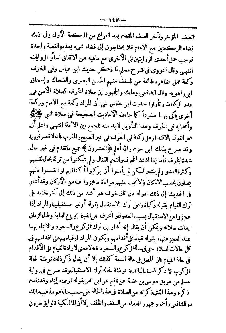 وَقَالَ النَّوَوِيُّ فِي شَرْحِ مُسْلِمٍ لَمَّا ذَكَرَ حَدِيثَ ابْنِ عَبَّاسٍ وَفِي الْخَوْفِ رَكْعَةٌ عَمِلَ بِظَاهِرِهِ طَائِفَةٌ مِنْ السَّلَفِ مِنْهُمْ الْحَسَنُ الْبَصْرِيُّ وَالضَّحَّاكُ وَإِسْحَاقُ بْنُ رَاهْوَيْهِ وَقَالَ الشَّافِعِيُّ وَمَالِكٌ وَالْجُمْهُورُ إنَّ صَلَاةَ الْخَوْفِ كَصَلَاةِ الْأَمْنِ فِي عَدَدِ الرَّكَعَاتِ وَتَأَوَّلُوا حَدِيثَ ابْنِ عَبَّاسٍ عَلَى أَنَّ الْمُرَادَ رَكْعَةٌ مَعَ الْإِمَامِ وَرَكْعَةٌ أُخْرَى يَأْتِي بِهَا مُنْفَرِدًا كَمَا جَاءَتْ الْأَحَادِيثُ الصَّحِيحَةُ فِي صَلَاةِ النَّبِيِّ - صَلَّى اللَّهُ عَلَيْهِ وَسَلَّمَ - وَأَصْحَابِهِ فِي الْخَوْفِ وَهَذَا التَّأْوِيلُ لَا بُدَّ مِنْهُ لِلْجَمْعِ بَيْنَ الْأَدِلَّةِ انْتَهَى وَاعْلَمْ أَنَّ مَحَلَّ الْقَوْلِ بِالِاقْتِصَارِ عَلَى رَكْعَةٍ فِي الْخَوْفِ فِي غَيْرِ الصُّبْحِ وَالْمَغْرِبِ فَإِنَّهُ لَا قَصْرَ فِيهِمَا وَقَدْ صَرَّحَ بِذَلِكَ ابْنُ حَزْمٍ وَاَللَّهُ أَعْلَمُ.