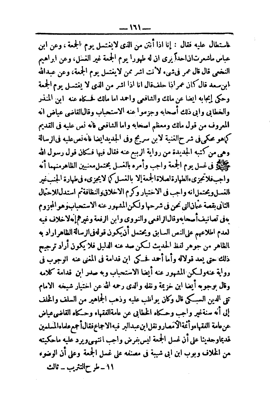 وَحَكَاهُ الْقَاضِي عِيَاضٌ عَنْ عَامَّةِ الْفُقَهَاءِ وَأَئِمَّةِ الْأَمْصَارِ وَنَقَلَ ابْنُ عَبْدِ الْبَرِّ فِيهِ الْإِجْمَاعَ فَقَالَ أَجْمَعَ عُلَمَاءُ الْمُسْلِمِينَ قَدِيمًا وَحَدِيثًا عَلَى أَنَّ غُسْلَ الْجُمُعَةِ لَيْسَ بِفَرْضٍ وَاجِبٍ انْتَهَى وَيَرُدُّ عَلَيْهِ مَا حَكَيْته مِنْ الْخِلَافِ وَبَوَّبَ ابْنُ أَبِي شَيْبَةَ فِي مُصَنَّفِهِ عَلَى غُسْلِ الْجُمُعَةِ وَعَلَى أَنَّ الْوُضُوءَ