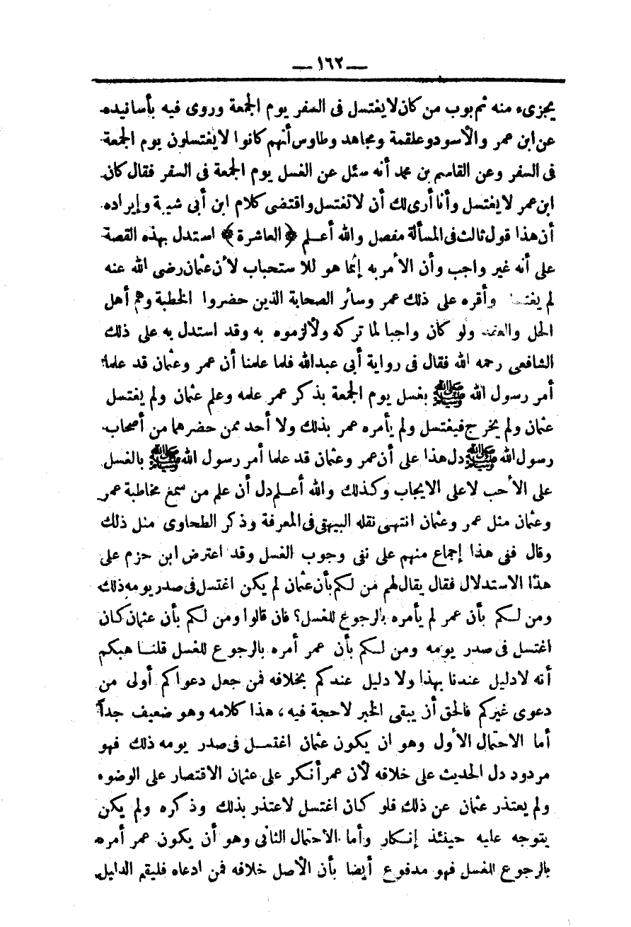 (الْعَاشِرَةُ) اُسْتُدِلَّ بِهَذِهِ الْقِصَّةِ عَلَى أَنَّهُ غَيْرُ وَاجِبٍ وَأَنَّ الْأَمْرَ بِهِ إنَّمَا هُوَ لِلِاسْتِحْبَابِ لِأَنَّ عُثْمَانَ - رَضِيَ اللَّهُ عَنْهُ - لَمْ يَغْتَسِلْ وَأَقَرَّهُ عَلَى ذَلِكَ عُمَرُ وَسَائِرُ الصَّحَابَةِ الَّذِينَ حَضَرُوا الْخُطْبَةَ وَهُمْ أَهْلُ الْحَلِّ وَالْعَقْدِ وَلَوْ كَانَ وَاجِبًا لَمَا تَرَكَهُ وَلَأَلْزَمُوهُ بِهِ وَقَدْ اسْتَدَلَّ بِهِ عَلَى ذَلِكَ الشَّافِعِيُّ - رَحِمَهُ اللَّهُ - فَقَالَ فِي رِوَايَةِ أَبِي عَبْدِ اللَّهِ فَلَمَّا عَلِمْنَا أَنَّ عُمَرَ وَعُثْمَانَ قَدْ عَلِمَا أَمْرَ رَسُولِ اللَّهِ - صَلَّى اللَّهُ عَلَيْهِ وَسَلَّمَ - بِغُسْلِ يَوْمِ الْجُمُعَةِ بِذِكْرِ عُمَرَ عِلْمَهُ وَعِلْمَ عُثْمَانُ وَلَمْ يَغْتَسِلْ عُثْمَانُ وَلَمْ يَخْرُجْ فَيَغْتَسِلَ وَلَمْ يَأْمُرْهُ عُمَرُ بِذَلِكَ وَلَا أَحَدٌ مِمَّنْ حَضَرَهُمَا مِنْ أَصْحَابِ رَسُولِ اللَّهِ - صَلَّى اللَّهُ عَلَيْهِ وَسَلَّمَ - دَلَّ هَذَا عَلَى أَنَّ عُمَرَ وَعُثْمَانَ قَدْ عَلِمَا أَمْرَ رَسُولِ اللَّهِ - صَلَّى اللَّهُ عَلَيْهِ وَسَلَّمَ - بِالْغُسْلِ عَلَى الْأَحَبِّ لَا عَلَى الْإِيجَابِ وَكَذَلِكَ وَاَللَّهُ أَعْلَمُ دَلَّ أَنَّ عِلْمَ مَنْ سَمِعَ مُخَاطَبَةَ عُمَرَ وَعُثْمَانَ مِثْلُ عُمَرَ وَعُثْمَانَ انْتَهَى نَقَلَهُ الْبَيْهَقِيُّ فِي الْمَعْرِفَةِ وَذَكَرَ الطَّحَاوِيُّ مِثْلَ ذَلِكَ وَقَالَ فَفِي هَذَا إجْمَاعٌ مِنْهُمْ عَلَى نَفْيِ وُجُوبِ الْغُسْلِ وَقَدْ اعْتَرَضَ ابْنُ حَزْمٍ عَلَى هَذَا الِاسْتِدْلَالِ فَقَالَ يُقَالُ لَهُمْ مَنْ لَكُمْ بِأَنَّ عُثْمَانَ لَمْ يَكُنْ اغْتَسَلَ فِي صَدْرِ يَوْمِهِ ذَلِكَ وَمَنْ لَكُمْ بِأَنَّ عُمَرَ لَمْ يَأْمُرْهُ بِالرُّجُوعِ لِلْغُسْلِ؟ فَإِنْ قَالُوا وَمَنْ لَكُمْ بِأَنَّ عُثْمَانَ كَانَ اغْتَسَلَ فِي صَدْرِ يَوْمِهِ وَمَنْ لَكُمْ بِأَنَّ عُمَرَ أَمَرَهُ بِالرُّجُوعِ لِلْغُسْلِ قُلْنَا هَبْكُمْ أَنَّهُ لَا دَلِيلَ عِنْدَنَا بِهَذَا وَلَا دَلِيلَ عِنْدَكُمْ بِخِلَافِهِ فَمَنْ جَعَلَ دَعْوَاكُمْ أَوْلَى مِنْ دَعْوَى غَيْرِكُمْ فَالْحَقُّ أَنْ يَبْقَى الْخَبَرُ لَا حُجَّةَ فِيهِ، هَذَا كَلَامُهُ وَهُوَ ضَعِيفٌ جِدًّا أَمَّا الِاحْتِمَالُ الْأَوَّلُ وَهُوَ أَنْ يَكُونَ عُثْمَانُ اغْتَسَلَ فِي صَدْرِ يَوْمِهِ ذَلِكَ فَهُوَ مَرْدُودٌ دَلَّ الْحَدِيثُ عَلَى خِلَافِهِ لِأَنَّ عُمَرَ أَنْكَرَ عَلَى عُثْمَانَ الِاقْتِصَارَ عَلَى الْوُضُوءِ وَلَمْ يَعْتَذِرْ عُثْمَانُ عَنْ ذَلِكَ فَلَوْ كَانَ اغْتَسَلَ لَاعْتَذَرَ بِذَلِكَ وَذَكَرَهُ وَلَمْ يَكُنْ يَتَوَجَّهُ عَلَيْهِ حِينَئِذٍ إنْكَارٌ وَأَمَّا الِاحْتِمَالُ الثَّانِي وَهُوَ أَنْ يَكُونَ عُمَرُ أَمَرَهُ بِالرُّجُوعِ لِلْغُسْلِ فَهُوَ مَدْفُوعٌ أَيْضًا بِأَنَّ الْأَصْلَ خِلَافُهُ فَمَنْ ادَّعَاهُ فَلْيُقِمْ الدَّلِيلَ