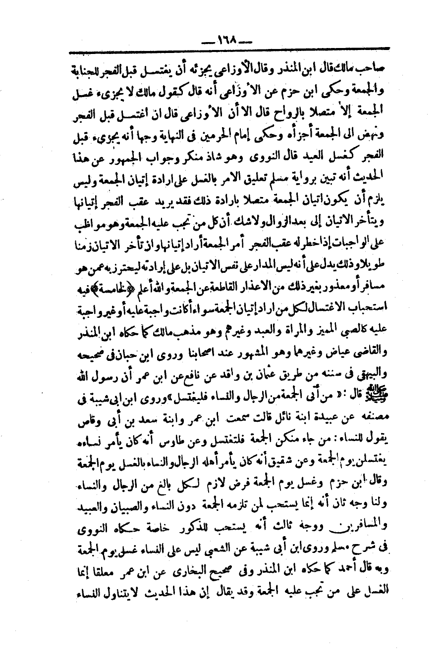 (الْخَامِسَةُ) فِيهِ اسْتِحْبَابُ الِاغْتِسَالِ لِكُلِّ مَنْ أَرَادَ إتْيَانَ الْجُمُعَةِ سَوَاءٌ أَكَانَتْ وَاجِبَةً عَلَيْهِ أَوْ غَيْرَ وَاجِبَةٍ عَلَيْهِ كَالصَّبِيِّ الْمُمَيِّزِ وَالْمَرْأَةِ وَالْعَبْدِ وَغَيْرِهِمْ وَهُوَ مَذْهَبُ مَالِكٍ كَمَا حَكَاهُ ابْنُ الْمُنْذِرِ وَالْقَاضِي عِيَاضٌ وَغَيْرُهُمَا وَهُوَ الْمَشْهُورُ عِنْدَ أَصْحَابِنَا وَرَوَى ابْنُ حِبَّانَ فِي صَحِيحِهِ وَالْبَيْهَقِيُّ فِي سُنَنِهِ مِنْ طَرِيقِ عُثْمَانَ بْنِ وَاقِدٍ عَنْ نَافِعٍ عَنْ ابْنِ عُمَرَ أَنَّ رَسُولَ اللَّهِ - صَلَّى اللَّهُ عَلَيْهِ وَسَلَّمَ - قَالَ: «مَنْ أَتَى الْجُمُعَةَ مِنْ الرِّجَالِ وَالنِّسَاءِ فَلْيَغْتَسِلْ» وَرَوَى ابْنُ أَبِي شَيْبَةَ فِي مُصَنَّفِهِ عَنْ عُبَيْدَةَ ابْنَةِ نَابِلٍ قَالَتْ سَمِعْت ابْنَ عُمَرَ وَابْنَةَ سَعْدِ بْنِ أَبِي وَقَّاصٍ يَقُولُ لِلنِّسَاءِ: مَنْ جَاءَ مِنْكُنَّ الْجُمُعَةَ فَلْتَغْتَسِلْ وَعَنْ طَاوُسٍ أَنَّهُ كَانَ يَأْمُرُ نِسَاءَهُ يَغْتَسِلْنَ يَوْمَ الْجُمُعَةِ وَعَنْ شَقِيقٍ أَنَّهُ كَانَ يَأْمُرُ أَهْلَهُ الرِّجَالَ وَالنِّسَاءَ بِالْغُسْلِ يَوْمَ الْجُمُعَةِ وَقَالَ ابْنُ حَزْمٍ وَغُسْلُ يَوْمِ الْجُمُعَةِ فَرْضٌ لَازِمٌ لِكُلِّ بَالِغٍ مِنْ الرِّجَالِ وَالنِّسَاءِ وَلَنَا وَجْهٌ ثَانٍ أَنَّهُ إنَّمَا يُسْتَحَبُّ لِمَنْ تَلْزَمُهُ الْجُمُعَةُ دُونَ النِّسَاءِ وَالصِّبْيَانِ وَالْعَبِيدِ وَالْمُسَافِرِينَ وَوَجْهٌ ثَالِثٌ أَنَّهُ يُسْتَحَبُّ لِلذُّكُورِ خَاصَّةً حَكَاهُ النَّوَوِيُّ فِي شَرْحِ مُسْلِمٍ وَرَوَى ابْنُ أَبِي شَيْبَةَ عَنْ الشَّعْبِيِّ لَيْسَ عَلَى النِّسَاءِ غُسْلٌ يَوْمَ الْجُمُعَةِ وَبِهِ قَالَ أَحْمَدُ كَمَا حَكَاهُ ابْنُ الْمُنْذِرِ وَفِي صَحِيحِ الْبُخَارِيِّ عَنْ ابْنِ عُمَرَ مُعَلَّقًا إنَّمَا الْغُسْلُ عَلَى مَنْ تَجِبُ عَلَيْهِ الْجُمُعَةُ وَقَدْ يُقَالُ إنَّ هَذَا الْحَدِيثَ لَا يَتَنَاوَلُ النِّسَاءَ