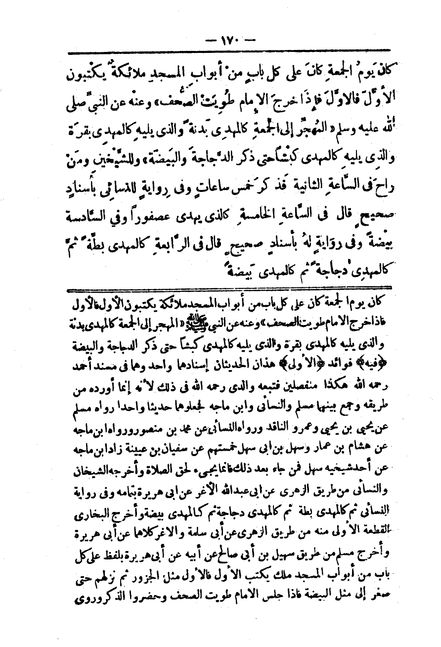 (الْأُولَى) هَذَانِ الْحَدِيثَانِ إسْنَادُهُمَا وَاحِدٌ وَهُمَا فِي مُسْنَدِ أَحْمَدَ - رَحِمَهُ اللَّهُ - هَكَذَا مُنْفَصِلَيْنِ فَتَبِعَهُ وَالِدِي - رَحِمَهُ اللَّهُ - فِي ذَلِكَ لِأَنَّهُ إنَّمَا أَوْرَدَهُ مِنْ طَرِيقِهِ وَجَمَعَ بَيْنَهُمَا مُسْلِمٌ وَالنَّسَائِيُّ وَابْنُ مَاجَهْ فَجَعَلُوهُمَا حَدِيثًا وَاحِدًا رَوَاهُ مُسْلِمٌ عَنْ يَحْيَى بْنِ يَحْيَى وَعَمْرٍو النَّاقِدِ وَرَوَاهُ النَّسَائِيّ عَنْ مُحَمَّدِ بْنِ مَنْصُورٍ وَرَوَاهُ ابْنُ مَاجَهْ عَنْ هِشَامِ بْنِ عَمَّارٍ وَسَهْلِ بْنِ أَبِي سَهْلٍ خَمْسَتُهُمْ عَنْ سُفْيَانَ بْنِ عُيَيْنَةَ زَادَ ابْنُ مَاجَهْ عَنْ أَحَدِ شَيْخَيْهِ سَهْلٍ «فَمَنْ جَاءَ بَعْدَ ذَلِكَ فَإِنَّمَا يَجِيءُ لِحَقِّ الصَّلَاةِ» وَأَخْرَجَهُ الشَّيْخَانِ وَالنَّسَائِيُّ مِنْ طَرِيقِ الزُّهْرِيِّ عَنْ أَبِي عَبْدِ اللَّهِ الْأَغَرِّ عَنْ أَبِي هُرَيْرَةَ بِتَمَامِهِ وَفِي رِوَايَةِ النَّسَائِيّ «ثُمَّ كَالْمُهْدِي بَطَّةً ثُمَّ كَالْمُهْدِي دَجَاجَةً ثُمَّ كَالْمُهْدِي بَيْضَةً» وَأَخْرَجَ الْبُخَارِيُّ الْقِطْعَةَ الْأُولَى مِنْهُ مِنْ طَرِيقِ الزُّهْرِيِّ عَنْ أَبِي سَلَمَةَ وَالْأَغَرِّ كِلَاهُمَا عَنْ أَبِي هُرَيْرَةَ وَأَخْرَجَ مُسْلِمٌ مِنْ طَرِيقِ سُهَيْلٍ مِنْ أَبِي صَالِحٍ عَنْ أَبِيهِ عَنْ أَبِي هُرَيْرَةَ بِلَفْظِ «عَلَى كُلِّ بَابٍ مِنْ أَبْوَابِ الْمَسْجِدِ مَلَكٌ يَكْتُبُ الْأَوَّلَ فَالْأَوَّلَ مَثَّلَ الْجَزُورَ ثُمَّ نَزَّلَهُمْ حَتَّى صَغَّرَ إلَى مِثْلِ الْبَيْضَةِ فَإِذَا جَلَسَ الْإِمَامُ طُوِيَتْ الصُّحُفُ وَحَضَرُوا الذِّكْرَ» وَرَوَى