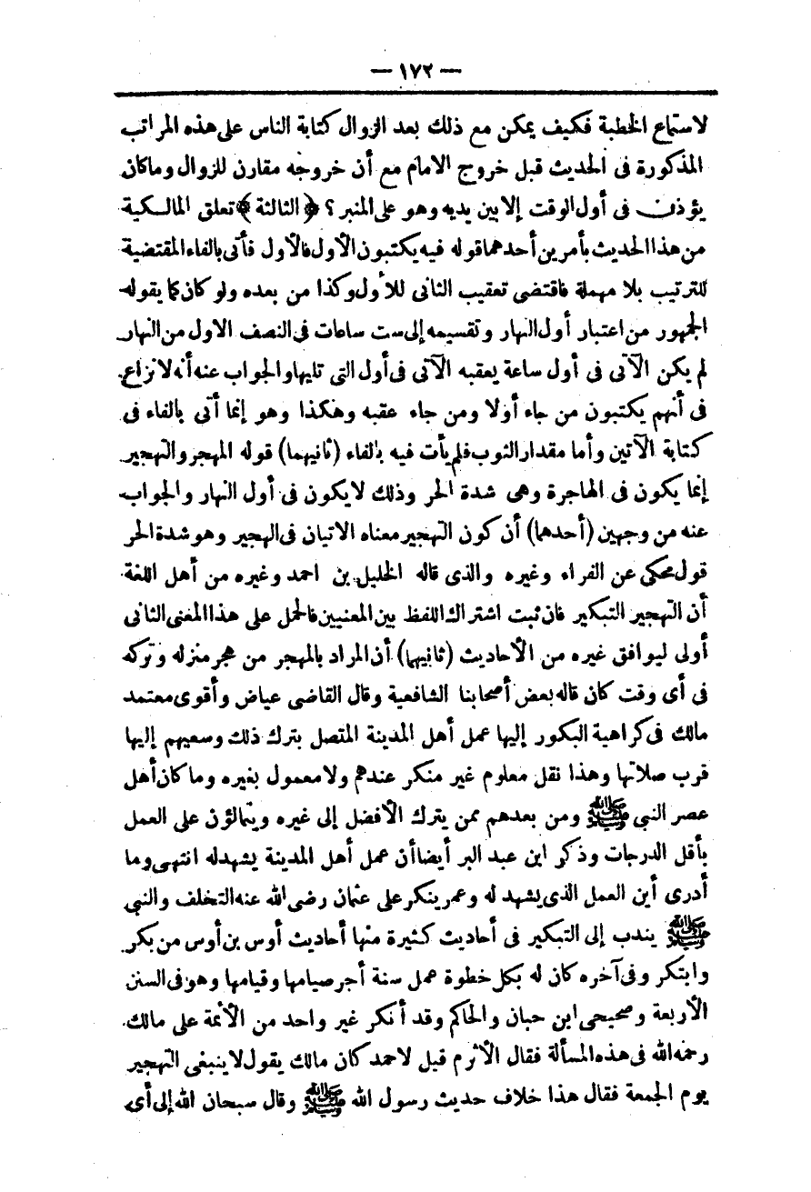 (الثَّالِثَةُ) تَعَلَّقَ الْمَالِكِيَّةُ مِنْ هَذَا الْحَدِيثِ بِأَمْرَيْنِ: أَحَدُهُمَا قَوْلُهُ فِيهِ يَكْتُبُونَ الْأَوَّلَ فَالْأَوَّلَ فَأَتَى بِالْفَاءِ الْمُقْتَضِيَةِ لِلتَّرْتِيبِ بِلَا مُهْلَةٍ فَاقْتَضَى تَعْقِيبَ الثَّانِي لِلْأَوَّلِ وَكَذَا مَنْ بَعْدَهُ وَلَوْ كَانَ كَمَا يَقُولُهُ الْجُمْهُورُ مِنْ اعْتِبَارِ أَوَّلِ النَّهَارِ وَتَقْسِيمِهِ إلَى سِتِّ سَاعَاتٍ فِي النِّصْفِ الْأَوَّلِ مِنْ النَّهَارِ لَمْ يَكُنْ الْآتِي فِي أَوَّلِ سَاعَةٍ يَعْقُبُهُ الْآتِي فِي أَوَّلِ الَّتِي تَلِيهَا وَالْجَوَابُ عَنْهُ أَنَّهُ لَا نِزَاعَ فِي أَنَّهُمْ يَكْتُبُونَ مَنْ جَاءَ أَوَّلًا وَمَنْ جَاءَ عَقِبَهُ وَهَكَذَا وَهُوَ إنَّمَا أَتَى بِالْفَاءِ فِي كِتَابَةِ الْآتِينَ وَأَمَّا مِقْدَارُ الثَّوْبِ فَلَمْ يَأْتِ فِيهِ بِالْفَاءِ (ثَانِيهِمَا) قَوْلُهُ الْمُهَجِّرُ وَالتَّهْجِيرُ إنَّمَا يَكُونُ فِي الْهَاجِرَةِ وَهِيَ شِدَّةُ الْحَرِّ وَذَلِكَ لَا يَكُونُ فِي أَوَّلِ النَّهَارِ وَالْجَوَابُ عَنْهُ مِنْ وَجْهَيْنِ:
