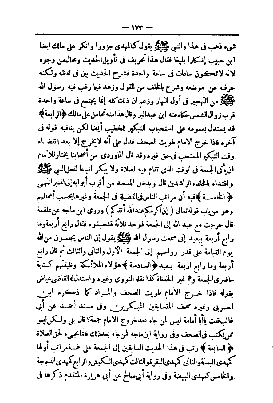 ـــــــــــــــــــــــــــــQشَيْءٍ ذَهَبَ فِي هَذَا وَالنَّبِيُّ - صَلَّى اللَّهُ عَلَيْهِ وَسَلَّمَ - يَقُولُ «كَالْمُهْدِي جَزُورًا» وَأَنْكَرَ عَلَى مَالِكٍ أَيْضًا ابْنُ حَبِيبٍ إنْكَارًا بَلِيغًا فَقَالَ هَذَا تَحْرِيفٌ فِي تَأْوِيلِ الْحَدِيثِ وَمُحَالٌ مِنْ وُجُوهٍ لِأَنَّهُ لَا تَكُونُ سَاعَاتٌ فِي سَاعَةٍ وَاحِدَةٍ فَشَرْحُ الْحَدِيثِ بَيِّنٌ فِي لَفْظِهِ وَلَكِنَّهُ حُرِّفَ عَنْ مَوْضِعِهِ وَشُرِحَ بِالْخُلْفِ مِنْ الْقَوْلِ وَزُهِدَ فِيمَا رَغَّبَ فِيهِ رَسُولُ اللَّهِ - صَلَّى اللَّهُ عَلَيْهِ وَسَلَّمَ - مِنْ التَّهْجِيرِ فِي أَوَّلِ النَّهَارِ وَزَعَمَ أَنَّ ذَلِكَ كُلَّهُ إنَّمَا يَجْتَمِعُ فِي سَاعَةٍ وَاحِدَةٍ قُرْبَ زَوَالِ الشَّمْسِ حَكَاهُ عَنْ ابْنِ عَبْدِ الْبَرِّ وَقَالَ هَذَا مِنْهُ تَحَامُلٌ عَلَى مَالِكٍ.