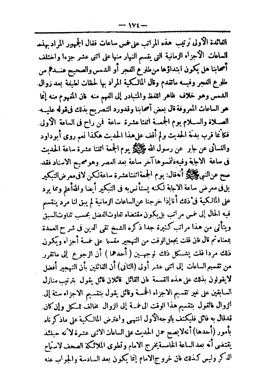 ـــــــــــــــــــــــــــــQالْفَائِدَةِ الْأُولَى تَرْتِيبُ هَذِهِ الْمَرَاتِبِ عَلَى خَمْسِ سَاعَاتٍ فَقَالَ الْجُمْهُورُ الْمُرَادُ بِهَذِهِ السَّاعَاتِ الْأَجْزَاءُ الزَّمَانِيَّةُ الَّتِي يُقَسَّمُ النَّهَارُ مِنْهَا عَلَى اثْنَيْ عَشَرَ جُزْءًا وَاخْتَلَفَ أَصْحَابُنَا هَلْ يَكُونُ ابْتِدَاؤُهَا مِنْ طُلُوعِ الْفَجْرِ أَوْ الشَّمْسِ وَالصَّحِيحُ عِنْدَهُمْ مِنْ طُلُوعِ الْفَجْرِ وَفِيهِ مَا تَقَدَّمَ وَقَالَ الْمَالِكِيَّةُ الْمُرَادُ بِهَا لَحَظَاتٌ لَطِيفَةٌ بَعْدَ زَوَالِ الشَّمْسِ وَهُوَ خِلَافُ ظَاهِرِ اللَّفْظِ وَالْمُتَبَادِرِ إلَى الْفَهْمِ مِنْهُ فَإِنَّ الْمَفْهُومَ مِنْهُ إنَّمَا هُوَ السَّاعَاتُ الْمَعْرُوفَةُ قَالَ بَعْضُ أَصْحَابِنَا وَقَدْ وَرَدَ التَّصْرِيحُ بِذَلِكَ فِي قَوْلِهِ - عَلَيْهِ الصَّلَاةُ وَالسَّلَامُ - يَوْمُ «الْجُمُعَةِ اثْنَتَا عَشْرَةَ سَاعَةً فَمَنْ رَاحَ فِي السَّاعَةِ الْأُولَى فَكَأَنَّمَا قَرَّبَ بَدَنَةً» الْحَدِيثَ وَلَمْ أَقِفْ عَلَى هَذَا الْحَدِيثِ هَكَذَا نَعَمْ رَوَى أَبُو دَاوُد وَالنَّسَائِيُّ عَنْ جَابِرٍ عَنْ رَسُولِ اللَّهِ - صَلَّى اللَّهُ عَلَيْهِ وَسَلَّمَ - «يَوْمُ الْجُمُعَةِ اثْنَتَا عَشْرَةَ سَاعَةً» الْحَدِيثُ فِي سَاعَةِ الْإِجَابَةِ وَفِيهِ «فَالْتَمِسُوهَا آخِرَ سَاعَةٍ بَعْدَ الْعَصْرِ» وَهُوَ صَحِيحُ الْإِسْنَادِ فَقَدْ صَحَّ عَنْ النَّبِيِّ - صَلَّى اللَّهُ عَلَيْهِ وَسَلَّمَ - أَنَّهُ قَالَ: «يَوْمُ الْجُمُعَةِ اثْنَتَا عَشْرَةَ سَاعَةً» لَكِنْ لَا فِي مَعْرِضِ التَّبْكِيرِ بَلْ فِي مَعْرِضِ سَاعَةِ الْإِجَابَةِ لَكِنَّهُ يُسْتَأْنَسُ بِهِ فِي التَّبْكِيرِ أَيْضًا وَاَللَّهُ أَعْلَمُ.
