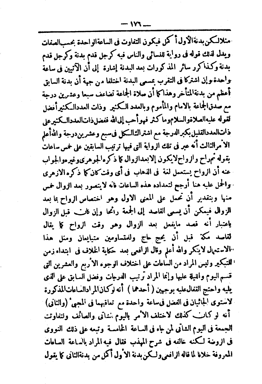 وَقَالَ الرَّافِعِيُّ بَعْدَ حِكَايَةِ الْخِلَافِ فِي ابْتِدَاءِ زَمَنِ التَّبْكِيرِ وَلَيْسَ الْمُرَادُ مِنْ السَّاعَاتِ عَلَى اخْتِلَافِ الْوُجُوهِ الْأَرْبَعِ وَالْعِشْرِينَ الَّتِي قُسِّمَ الْيَوْمُ وَاللَّيْلَةُ عَلَيْهَا وَإِنَّمَا الْمُرَادُ تَرْتِيبُ الدَّرَجَاتِ وَفَضْلُ السَّابِقِ عَلَى الَّذِي يَلِيهِ وَاحْتَجَّ الْقَفَّالُ عَلَيْهِ بِوَجْهَيْنِ (أَحَدُهُمَا) أَنَّهُ لَوْ كَانَ الْمُرَادُ السَّاعَاتِ الْمَذْكُورَةَ لَاسْتَوَى الْجَائِيَانِ فِي الْفَضْلِ فِي سَاعَةٍ وَاحِدَةٍ مَعَ تَعَاقُبِهِمَا فِي الْمَجِيءِ (وَالثَّانِي) أَنَّهُ لَوْ كَانَ كَذَلِكَ لَاخْتَلَفَ الْأَمْرُ بِالْيَوْمِ الشَّاتِي وَالصَّائِفِ وَلِتَفَاوُتِ الْجُمُعَةِ فِي الْيَوْمِ الشَّاتِي لِمَنْ جَاءَ فِي السَّاعَةِ الْخَامِسَةِ وَتَبِعَهُ عَلَى ذَلِكَ النَّوَوِيُّ فِي الرَّوْضَةِ لَكِنَّهُ خَالَفَهُ فِي شَرْحِ الْمُهَذَّبِ فَقَالَ فِيهِ الْمُرَادُ بِالسَّاعَةِ السَّاعَاتُ الْمَعْرُوفَةُ خِلَافًا لِمَا قَالَهُ الرَّافِعِيُّ وَلَكِنَّ بَدَنَةَ الْأَوَّلِ أَكْمَلُ مِنْ بَدَنَةِ الثَّانِي كَمَا يَقُولُ