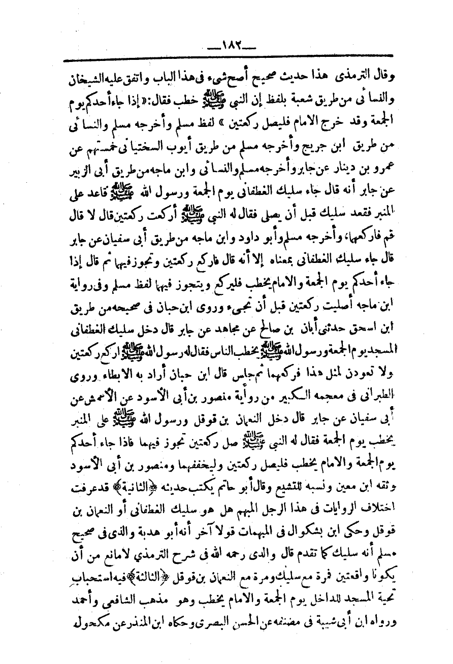 ـــــــــــــــــــــــــــــQوَقَالَ التِّرْمِذِيُّ هَذَا حَدِيثٌ صَحِيحٌ أَصَحُّ شَيْءٍ فِي هَذَا الْبَابِ وَاتَّفَقَ عَلَيْهِ الشَّيْخَانِ وَالنَّسَائِيُّ مِنْ طَرِيقِ شُعْبَةَ بِلَفْظِ إنَّ النَّبِيَّ - صَلَّى اللَّهُ عَلَيْهِ وَسَلَّمَ - خَطَبَ فَقَالَ: «إذَا جَاءَ أَحَدُكُمْ يَوْمَ الْجُمُعَةِ وَقَدْ خَرَجَ الْإِمَامُ فَلْيُصَلِّ رَكْعَتَيْنِ» لَفْظُ مُسْلِمٍ وَأَخْرَجَهُ مُسْلِمٌ وَالنَّسَائِيُّ مِنْ طَرِيقِ ابْنِ جُرَيْجٍ وَأَخْرَجَهُ مُسْلِمٌ مِنْ طَرِيقِ أَيُّوبَ السِّخْتِيَانِيُّ خَمْسَتُهُمْ عَنْ عَمْرِو بْنِ دِينَارٍ عَنْ جَابِرٍ وَأَخْرَجَهُ مُسْلِمٌ وَالنَّسَائِيُّ وَابْنُ مَاجَهْ مِنْ طَرِيقِ أَبِي الزُّبَيْرِ عَنْ جَابِرٍ أَنَّهُ قَالَ «جَاءَ سُلَيْكٌ الْغَطَفَانِيُّ يَوْمَ الْجُمُعَةِ وَرَسُولُ اللَّهِ - صَلَّى اللَّهُ عَلَيْهِ وَسَلَّمَ - قَاعِدٌ عَلَى الْمِنْبَرِ فَقَعَدَ سُلَيْكٌ قَبْلَ أَنْ يُصَلِّيَ فَقَالَ لَهُ النَّبِيُّ - صَلَّى اللَّهُ عَلَيْهِ وَسَلَّمَ - أَرَكَعْت رَكْعَتَيْنِ قَالَ لَا قَالَ قُمْ فَارْكَعْهُمَا» ، وَأَخْرَجَهُ مُسْلِمٌ وَأَبُو دَاوُد وَابْنُ مَاجَهْ مِنْ طَرِيقِ أَبِي سُفْيَانَ عَنْ جَابِرٍ قَالَ «جَاءَ سُلَيْكٌ الْغَطَفَانِيُّ بِمَعْنَاهُ إلَّا أَنَّهُ قَالَ فَارْكَعْ رَكْعَتَيْنِ وَتَجَوَّزْ فِيهِمَا ثُمَّ قَالَ إذَا جَاءَ أَحَدُكُمْ يَوْمَ الْجُمُعَةِ وَالْإِمَامُ يَخْطُبُ فَلْيَرْكَعْ وَيَتَجَوَّزْ فِيهِمَا» لَفْظُ مُسْلِمٍ وَفِيهِ رِوَايَةُ ابْنِ مَاجَهْ «أَصْلَيْت رَكْعَتَيْنِ قَبْلَ أَنْ تَجِيءَ» وَرَوَى ابْنُ حِبَّانَ فِي صَحِيحِهِ مِنْ طَرِيقِ ابْنِ إِسْحَاقَ حَدَّثَنِي أَبَانُ بْنُ صَالِحٍ عَنْ مُجَاهِدٍ عَنْ جَابِرٍ قَالَ «دَخَلَ سُلَيْكٌ الْغَطَفَانِيُّ الْمَسْجِدَ يَوْمَ الْجُمُعَةِ وَرَسُولُ اللَّهِ - صَلَّى اللَّهُ عَلَيْهِ وَسَلَّمَ - يَخْطُبُ النَّاسَ فَقَالَ لَهُ رَسُولُ اللَّهِ - صَلَّى اللَّهُ عَلَيْهِ وَسَلَّمَ - ارْكَعْ رَكْعَتَيْنِ وَلَا تَعُودَنَّ لِمِثْلِ هَذَا فَرَكَعَهُمَا ثُمَّ جَلَسَ» قَالَ ابْنُ حِبَّانَ أَرَادَ بِهِ الْإِبْطَاءَ وَرَوَى الطَّبَرَانِيُّ فِي مُعْجَمِهِ الْكَبِيرِ مِنْ رِوَايَةِ مَنْصُورِ بْنِ أَبِي الْأَسْوَدِ عَنْ الْأَعْمَشِ عَنْ أَبِي سُفْيَانَ عَنْ جَابِرٍ قَالَ «دَخَلَ النُّعْمَانُ بْنُ قَوْقَلٍ وَرَسُولُ اللَّهِ - صَلَّى اللَّهُ عَلَيْهِ وَسَلَّمَ - عَلَى الْمِنْبَرِ يَخْطُبُ يَوْمَ الْجُمُعَةِ فَقَالَ لَهُ النَّبِيُّ - صَلَّى اللَّهُ عَلَيْهِ وَسَلَّمَ - صَلِّ رَكْعَتَيْنِ تَجَوَّزْ فِيهِمَا فَإِذَا جَاءَ أَحَدُكُمْ يَوْمَ الْجُمُعَةِ وَالْإِمَامُ يَخْطُبُ فَلِيُصَلِّ رَكْعَتَيْنِ وَلْيُخَفِّفْهُمَا» وَمَنْصُورُ بْنُ أَبِي الْأَسْوَدِ وَثَّقَهُ ابْنُ مَعِينٍ وَنَسَبَهُ لِلتَّشَيُّعِ وَقَالَ أَبُو حَاتِمٍ يُكْتَبُ حَدِيثُهُ.