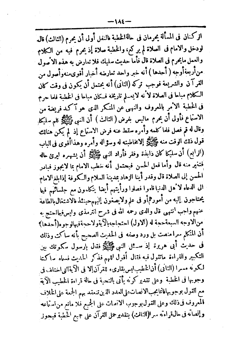 (الرَّابِعُ) أَنَّ سُلَيْكًا كَانَ ذَا بَذَّةٍ وَفَقْرٍ فَأَرَادَ النَّبِيُّ - صَلَّى اللَّهُ عَلَيْهِ وَسَلَّمَ - أَنْ يُشْهِرَهُ لِيَرَى فَيُغَيِّرَ مِنْهُ قَالَ وَأَمَّا فِعْلُ الْحَسَنُ فَيُحْتَمَلُ أَنَّهُ خَطَبَ الْإِمَامُ بِمَا لَا يَجُوزُ فَبَادَرَ الْحَسَنُ إلَى الصَّلَاةِ قَالَ وَقَدْ رَأَيْنَا الزُّهَّادَ بِمَدِينَةِ السَّلَامِ وَالْكُوفَةِ إذَا بَلَغَ الْإِمَامُ إلَى الدُّعَاءِ لِأَهْلِ الدُّنْيَا قَامُوا فَصَلَّوْا وَرَأَيْتهمْ أَيْضًا يَتَكَلَّمُونَ مَعَ جُلَسَائِهِمْ فِيمَا يَحْتَاجُونَ إلَيْهِ مِنْ أُمُورِهِمْ أَوْ فِي عِلْمٍ وَلَا يَصْغَوْنَ إلَيْهِمْ حِينَئِذٍ فَالِاشْتِغَالُ بِالطَّاعَةِ عَنْهُمْ وَاجِبٌ انْتَهَى قَالَ وَالِدِي - رَحِمَهُ اللَّهُ - فِي شَرْحِ التِّرْمِذِيِّ وَلَيْسَ فِيمَا احْتَجَّ بِهِ مِنْ الْأَوْجُهِ السَّبْعَةِ حُجَّةٌ لَهُ.