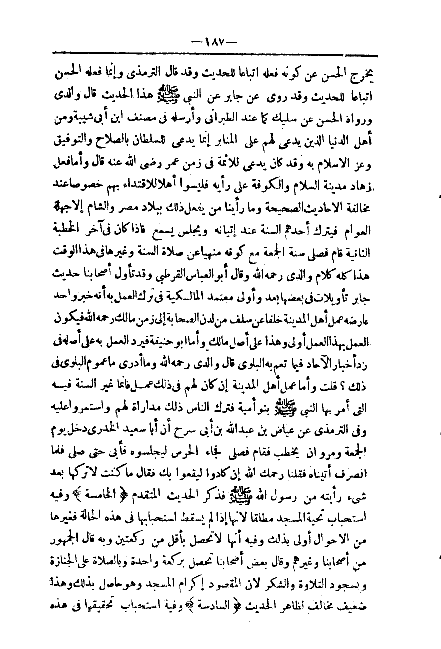 ـــــــــــــــــــــــــــــQيَخْرُجُ الْحَسَنُ عَنْ كَوْنِهِ فَعَلَهُ اتِّبَاعًا لِلْحَدِيثِ وَقَدْ قَالَ التِّرْمِذِيُّ وَإِنَّمَا فَعَلَهُ الْحَسَنُ اتِّبَاعًا لِلْحَدِيثِ وَقَدْ رُوِيَ عَنْ جَابِرٍ عَنْ النَّبِيِّ - صَلَّى اللَّهُ عَلَيْهِ وَسَلَّمَ - هَذَا الْحَدِيثُ قَالَ وَالِدِي وَرَوَاهُ الْحَسَنُ عَنْ سُلَيْكٍ كَمَا عِنْدَ الطَّبَرَانِيِّ وَأَرْسَلَهُ فِي مُصَنَّفِ ابْنِ أَبِي شَيْبَةَ وَمِنْ أَهْلِ الدُّنْيَا الَّذِينَ يُدْعَى لَهُمْ عَلَى الْمَنَابِرِ إنَّمَا يُدْعَى لِلسُّلْطَانِ بِالصَّلَاحِ وَالتَّوْفِيقِ وَعِزِّ الْإِسْلَامِ بِهِ وَقَدْ كَانَ يُدْعَى لِلْأَئِمَّةِ فِي زَمَنِ عُمَرَ - رَضِيَ اللَّهُ عَنْهُ - قَالَ وَأَمَّا فِعْلُ زُهَّادِ مَدِينَةِ السَّلَامِ وَالْكُوفَةِ عَلَى رَأْيِهِ فَلَيْسُوا أَهْلًا لِلِاقْتِدَاءِ بِهِمْ خُصُوصًا عِنْدَ مُخَالَفَةِ الْأَحَادِيثِ الصَّحِيحَةِ وَمَا رَأَيْنَا مَنْ يَفْعَلُ ذَلِكَ بِبِلَادِ مِصْرَ وَالشَّامِ إلَّا جَهَلَةَ الْعَوَامّ فَيَتْرُكُ أَحَدُهُمْ السُّنَّةَ عِنْدَ إتْيَانِهِ وَيَجْلِسُ يَسْمَعُ فَإِذَا كَانَ فِي آخِرِ الْخُطْبَةِ الثَّانِيَةِ قَامَ فَصَلَّى سُنَّةَ الْجُمُعَةِ مَعَ كَوْنِهِ مَنْهِيًّا عَنْ صَلَاةِ السُّنَّةِ وَغَيْرِهَا فِي هَذَا الْوَقْتِ هَذَا كُلُّهُ كَلَامُ وَالِدِي - رَحِمَهُ اللَّهُ - وَقَالَ أَبُو الْعَبَّاسِ الْقُرْطُبِيُّ وَقَدْ تَأَوَّلَ أَصْحَابُنَا حَدِيثَ جَابِرٍ تَأْوِيلَاتٍ فِي بَعْضِهَا بُعْدٌ وَأَوْلَى مُعْتَمَدِ الْمَالِكِيَّةِ فِي تَرْكِ الْعَمَلِ بِهِ أَنَّهُ خَبَرٌ وَاحِدٌ عَارَضَهُ عَمَلُ أَهْلِ الْمَدِينَةِ خَلَفًا عَنْ سَلَفٍ مِنْ لَدُنْ الصَّحَابَةِ إلَى زَمَنِ مَالِكٍ - رَحِمَهُ اللَّهُ - فَيَكُونُ الْعَمَلُ بِهَذَا الْعَمَلِ أَوْلَى وَهَذَا عَلَى أَصْلِ مَالِكٍ وَأَمَّا أَبُو حَنِيفَةَ فَيَرُدُّ الْعَمَلَ بِهِ عَلَى أَصْلِهِ فِي رَدِّ أَخْبَارِ الْآحَادِ فِيمَا تَعُمُّ بِهِ الْبَلْوَى قَالَ وَالِدِي - رَحِمَهُ اللَّهُ - وَمَا أَدْرِي مَا عُمُومُ الْبَلْوَى فِي ذَلِكَ؟ قُلْت وَأَمَّا عَمَلُ أَهْلِ الْمَدِينَةِ إنْ كَانَ لَهُمْ فِي ذَلِكَ عَمَلٌ فَإِنَّمَا غَيَّرَ السُّنَّةَ فِيهِ الَّتِي أَمَرَ بِهَا النَّبِيُّ - صَلَّى اللَّهُ عَلَيْهِ وَسَلَّمَ - بَنُو أُمَيَّةَ فَتَرَكَ النَّاسُ ذَلِكَ مُدَارَاةً لَهُمْ وَاسْتَمَرُّوا عَلَيْهِ وَفِي التِّرْمِذِيِّ عَنْ عِيَاضِ بْنِ عَبْدِ اللَّهِ بْنِ أَبِي سَرْحٍ أَنَّ أَبَا سَعِيدٍ الْخُدْرِيِّ «دَخَلَ يَوْمَ الْجُمُعَةِ وَمَرْوَانُ يَخْطُبُ فَقَامَ فَصَلَّى فَجَاءَ الْحَرَسُ لِيُجْلِسُوهُ فَأَبَى حَتَّى صَلَّى فَلَمَّا انْصَرَفَ أَتَيْنَاهُ فَقُلْنَا رَحِمَك اللَّهُ إنْ كَادُوا لَيَقَعُوا بِك فَقَالَ مَا كُنْت لِأَتْرُكَهَا بَعْدَ شَيْءٍ رَأَيْته مِنْ رَسُولِ اللَّهِ - صَلَّى اللَّهُ عَلَيْهِ وَسَلَّمَ -» فَذَكَرَ الْحَدِيثَ الْمُتَقَدِّمَ