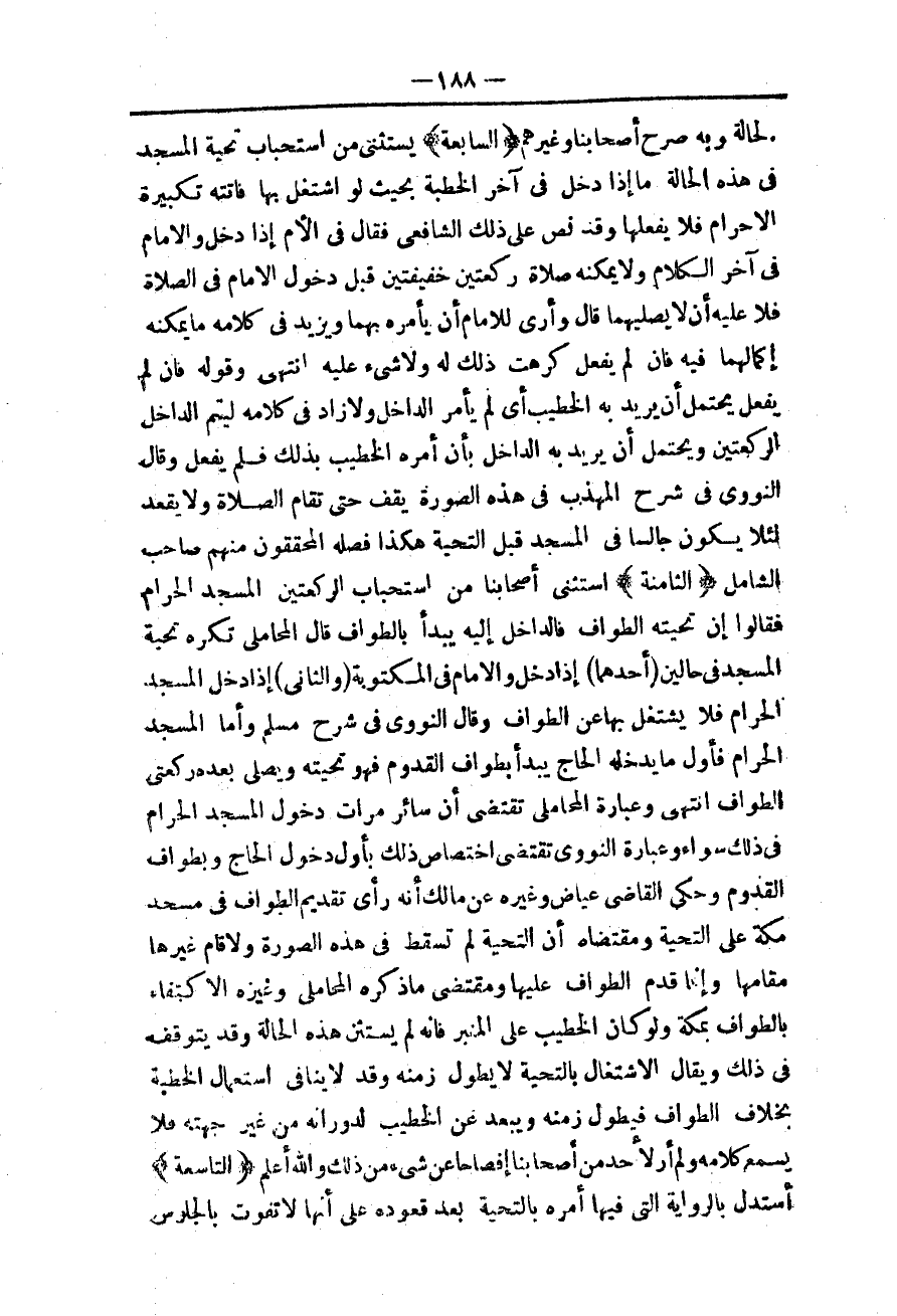 (الثَّامِنَةُ) اسْتَثْنَى أَصْحَابُنَا مِنْ اسْتِحْبَابِ الرَّكْعَتَيْنِ الْمَسْجِدَ الْحَرَامَ فَقَالُوا إنَّ تَحِيَّتَهُ الطَّوَافُ فَالدَّاخِلُ إلَيْهِ يَبْدَأُ بِالطَّوَافِ قَالَ الْمَحَامِلِيُّ تُكْرَهُ تَحِيَّةُ الْمَسْجِدِ فِي حَالَيْنِ (أَحَدُهُمَا) إذَا دَخَلَ وَالْإِمَامُ فِي الْمَكْتُوبَةِ (وَالثَّانِي) إذَا دَخَلَ الْمَسْجِدَ الْحَرَامَ فَلَا يَشْتَغِلُ بِهَا عَنْ الطَّوَافِ وَقَالَ النَّوَوِيُّ فِي شَرْحِ مُسْلِمٍ وَأَمَّا الْمَسْجِدُ الْحَرَامُ فَأَوَّلُ مَا يَدْخُلُهُ الْحَاجُّ يَبْدَأُ بِطَوَافِ الْقُدُومِ فَهُوَ تَحِيَّتُهُ وَيُصَلِّي بَعْدَهُ رَكْعَتَيْ الطَّوَافِ انْتَهَى وَعِبَارَةُ الْمَحَامِلِيِّ تَقْتَضِي أَنَّ سَائِرَ مَرَّاتِ دُخُولِ الْمَسْجِدِ الْحَرَامِ فِي ذَلِكَ سَوَاءٌ وَعِبَارَةُ النَّوَوِيِّ تَقْتَضِي اخْتِصَاصَ ذَلِكَ بِأَوَّلِ دُخُولِ الْحَاجِّ وَبِطَوَافِ الْقُدُومِ وَحَكَى الْقَاضِي عِيَاضٌ وَغَيْرُهُ عَنْ مَالِكٍ أَنَّهُ رَأَى تَقْدِيمَ الطَّوَافِ فِي مَسْجِدِ مَكَّةَ عَلَى التَّحِيَّةِ وَمُقْتَضَاهُ أَنَّ التَّحِيَّةَ لَمْ تَسْقُطْ فِي هَذِهِ الصُّورَةِ وَلَا قَامَ غَيْرُهَا مَقَامَهَا وَإِنَّمَا قُدِّمَ الطَّوَافُ عَلَيْهَا وَمُقْتَضَى مَا ذَكَرَهُ الْمَحَامِلِيُّ وَغَيْرُهُ الِاكْتِفَاءُ بِالطَّوَافِ بِمَكَّةَ وَلَوْ كَانَ الْخَطِيبُ عَلَى الْمِنْبَرِ فَإِنَّهُ لَمْ يَسْتَثْنِ هَذِهِ الْحَالَةَ وَقَدْ يُتَوَقَّفُ فِي ذَلِكَ وَيُقَالُ الِاشْتِغَالُ بِالتَّحِيَّةِ لَا يَطُولُ زَمَنُهُ وَقَدْ لَا يُنَافِي اسْتِعْمَالَ الْخُطْبَةِ بِخِلَافِ الطَّوَافِ فَيَطُولُ زَمَنُهُ وَيَبْعُدُ عَنْ الْخَطِيبِ لِدَوَرَانِهِ مِنْ غَيْرِ جِهَتِهِ فَلَا يَسْمَعُ كَلَامَهُ وَلَمْ أَرَ لِأَحَدٍ مِنْ أَصْحَابِنَا إفْصَاحًا عَنْ شَيْءٍ مِنْ ذَلِكَ وَاَللَّهُ أَعْلَمُ.