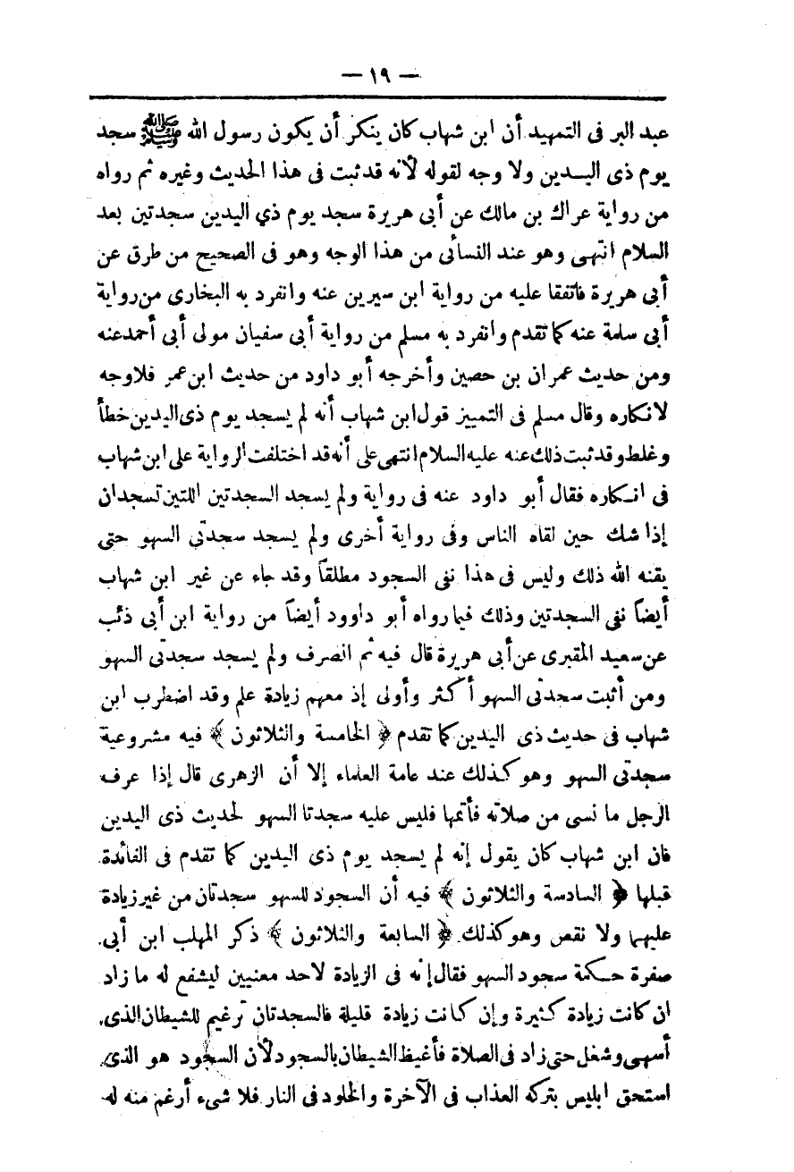 عَلَى أَنَّهُ قَدْ اخْتَلَفَتْ الرِّوَايَةُ عَلَى ابْنِ شِهَابٍ فِي إنْكَارِهِ فَقَالَ أَبُو دَاوُد عَنْهُ فِي رِوَايَةٍ «وَلَمْ يَسْجُدْ السَّجْدَتَيْنِ اللَّتَيْنِ تُسْجَدَانِ إذَا شَكَّ حِينَ تَلَقَّاهُ النَّاسُ» وَفِي رِوَايَةٍ أُخْرَى «وَلَمْ يَسْجُدْ سَجْدَتَيْ السَّهْوِ حَتَّى يَقَّنَهُ اللَّهُ ذَلِكَ» وَلَيْسَ فِي هَذَا نَفْيُ السُّجُودِ مُطْلَقًا وَقَدْ جَاءَ عَنْ غَيْرِ ابْنِ شِهَابٍ أَيْضًا نَفْيُ السَّجْدَتَيْنِ وَذَلِكَ فِيمَا رَوَاهُ أَبُو دَاوُد أَيْضًا مِنْ رِوَايَةِ ابْنِ أَبِي ذِئْبٍ عَنْ سَعِيدٍ الْمَقْبُرِيِّ عَنْ أَبِي هُرَيْرَةَ قَالَ فِيهِ «ثُمَّ انْصَرَفَ وَلَمْ يَسْجُدْ سَجْدَتَيْ السَّهْوِ» وَمَنْ أَثْبَتَ سَجْدَتَيْ السَّهْوِ أَكْثَرُ وَأَوْلَى إذْ مَعَهُمْ زِيَادَةُ عِلْمٍ وَقَدْ اضْطَرَبَ ابْنُ شِهَابٍ فِي حَدِيثِ ذِي الْيَدَيْنِ كَمَا تَقَدَّمَ.
