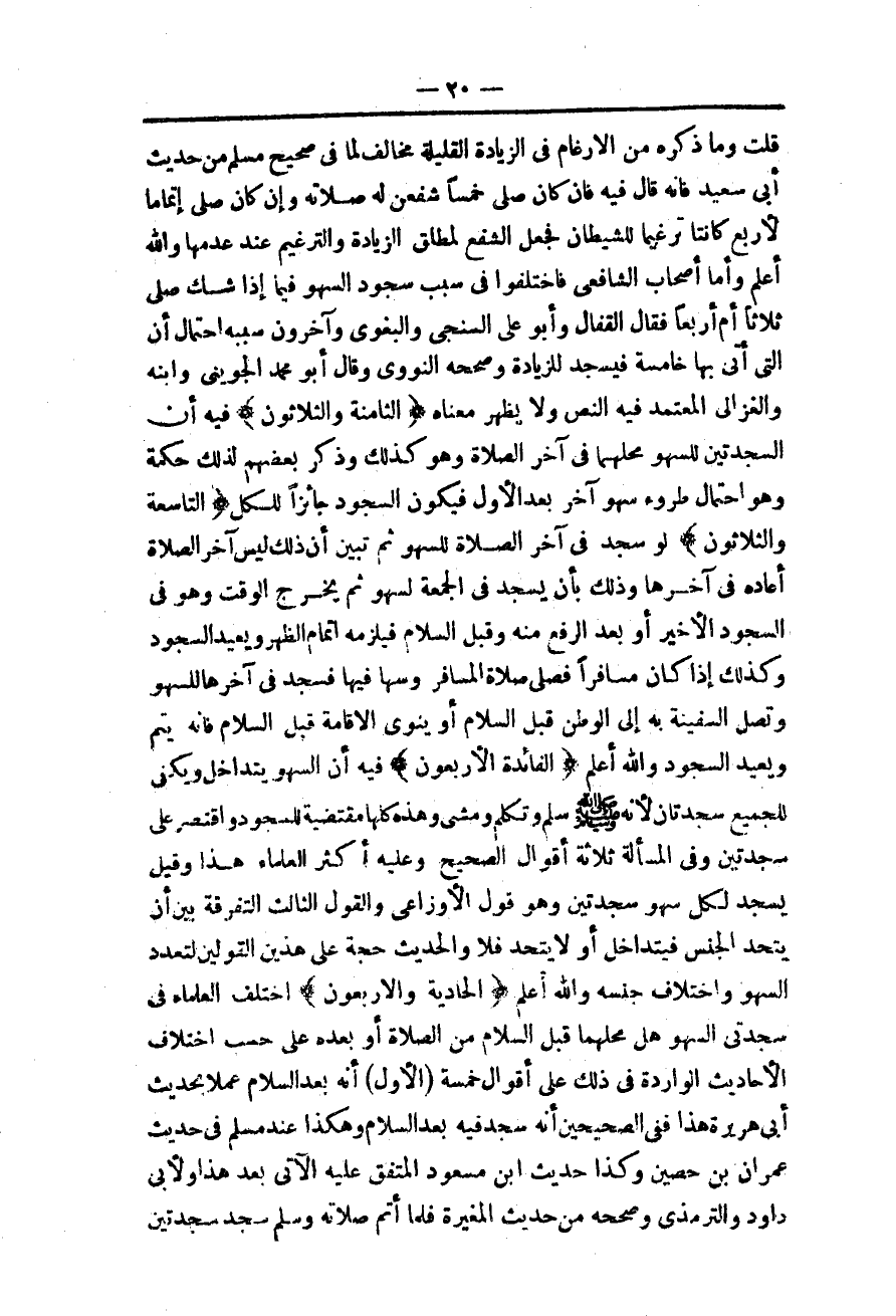{الْحَادِيَةُ وَالْأَرْبَعُونَ} اخْتَلَفَ الْعُلَمَاءُ فِي سَجْدَتَيْ السَّهْوِ هَلْ مَحَلُّهُمَا قَبْلَ السَّلَامِ مِنْ الصَّلَاةِ أَوْ بَعْدَهُ عَلَى حَسَبِ اخْتِلَافِ الْأَحَادِيثِ الْوَارِدَةِ فِي ذَلِكَ عَلَى أَقْوَالٍ خَمْسَةٍ: (الْأَوَّلُ) أَنَّهُ بَعْدَ السَّلَامِ عَمَلًا بِحَدِيثِ أَبِي هُرَيْرَةَ هَذَا فَفِي الصَّحِيحَيْنِ «أَنَّهُ سَجَدَ فِيهِ بَعْدَ السَّلَامِ» وَهَكَذَا عِنْدَ مُسْلِمٍ فِي حَدِيثِ عِمْرَانَ بْنِ حُصَيْنٍ وَكَذَا حَدِيثُ ابْنِ مَسْعُودٍ الْمُتَّفَقُ عَلَيْهِ الْآتِي بَعْدَ هَذَا وَلِأَبِي دَاوُد وَالتِّرْمِذِيِّ وَصَحَّحَهُ مِنْ حَدِيثِ الْمُغِيرَةِ «فَلَمَّا أَتَمَّ صَلَاتَهُ وَسَلَّمَ سَجَدَ سَجْدَتَيْنِ»