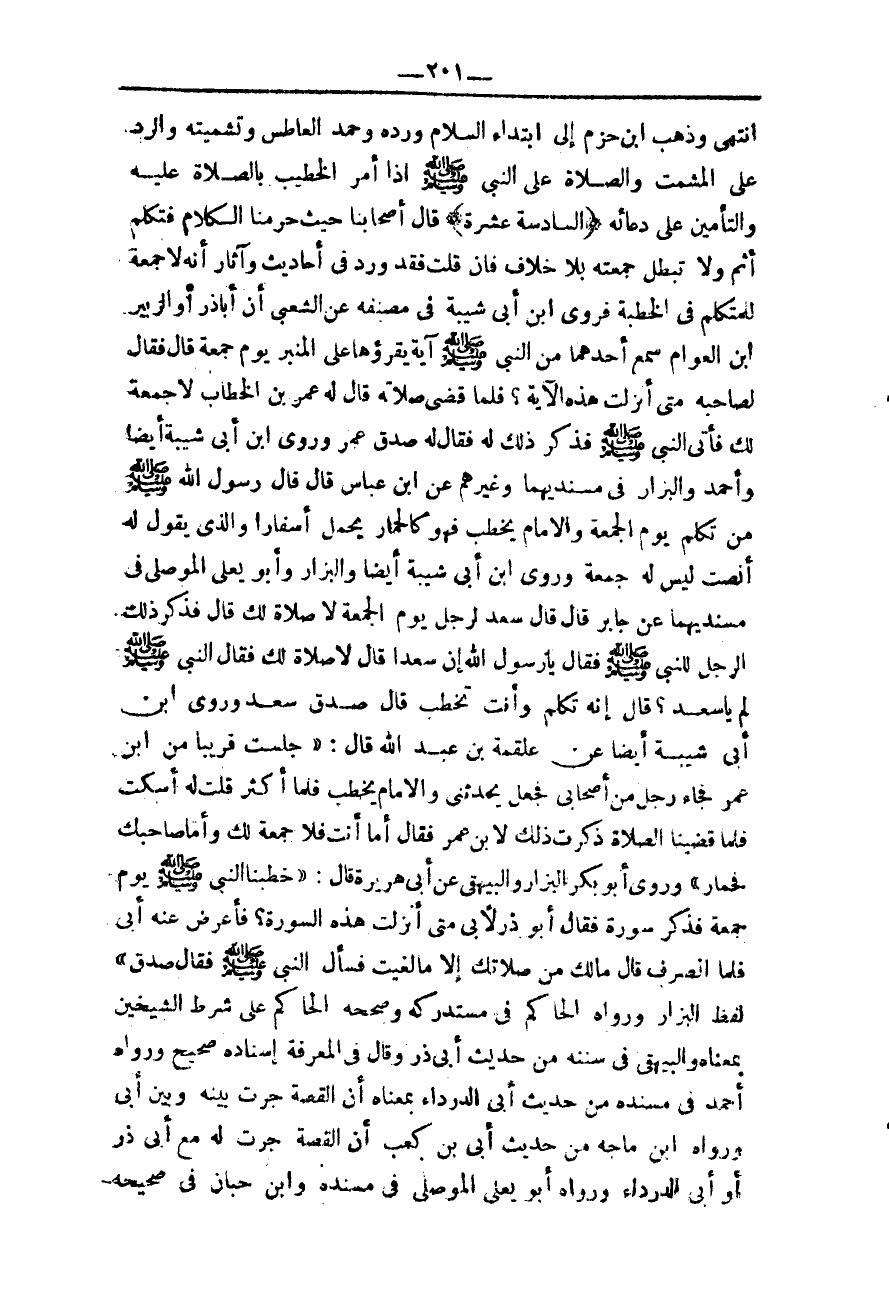 وَرَوَى ابْنُ أَبِي شَيْبَةَ أَيْضًا وَأَحْمَدُ وَالْبَزَّارُ فِي مُسْنَدَيْهِمَا وَغَيْرُهُمْ عَنْ ابْنِ عَبَّاسٍ قَالَ قَالَ رَسُولُ اللَّهِ - صَلَّى اللَّهُ عَلَيْهِ وَسَلَّمَ - «مَنْ تَكَلَّمَ يَوْمَ الْجُمُعَةِ وَالْإِمَامُ يَخْطُبُ فَهُوَ كَالْحِمَارِ يَحْمِلُ أَسْفَارًا وَاَلَّذِي يَقُولُ لَهُ أَنْصِتْ لَيْسَ لَهُ جُمُعَةٌ» .