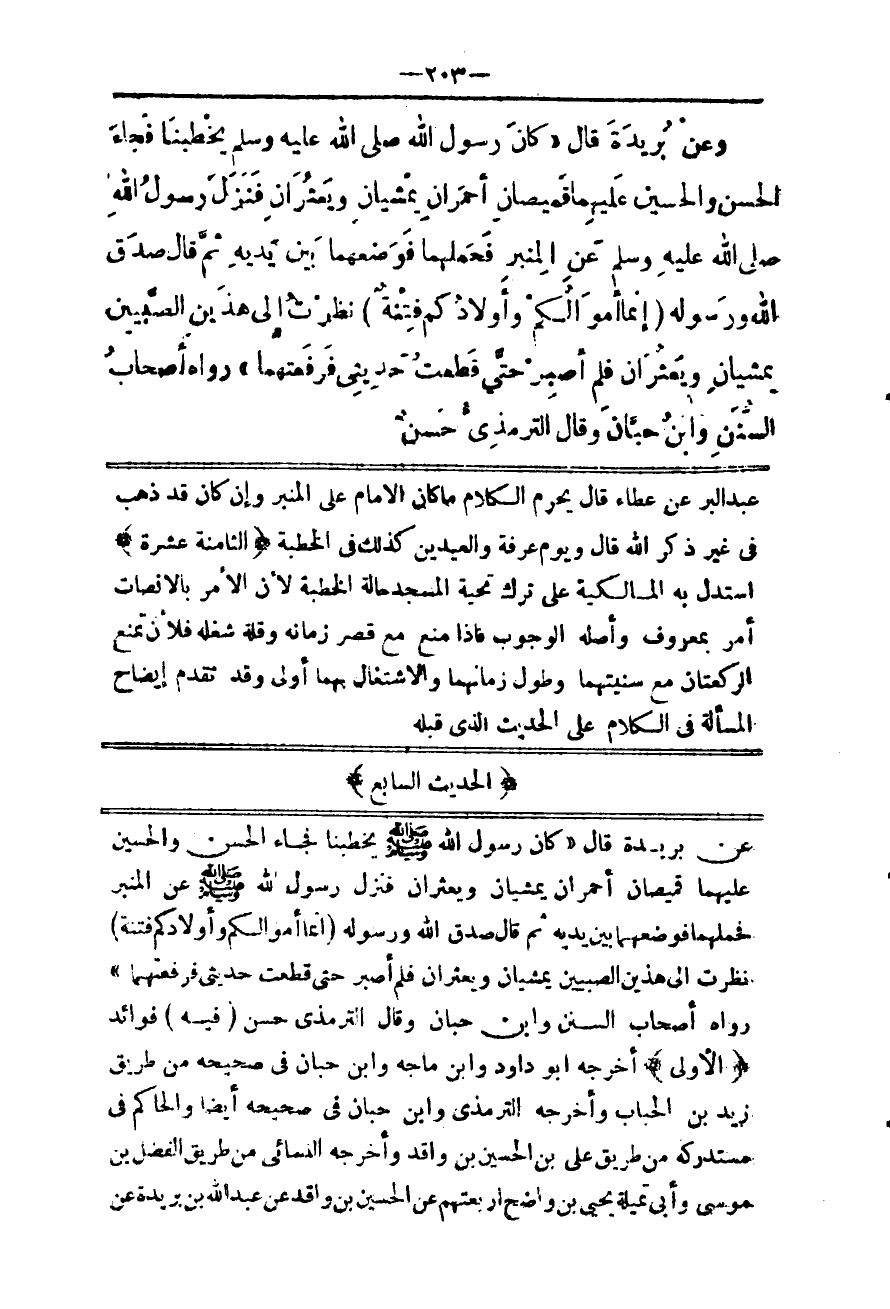 (الْحَدِيثُ السَّابِعُ) عَنْ بُرَيْدَةَ قَالَ «كَانَ رَسُولُ اللَّهِ - صَلَّى اللَّهُ عَلَيْهِ وَسَلَّمَ - يَخْطُبُنَا فَجَاءَ الْحَسَنُ وَالْحُسَيْنُ عَلَيْهِمَا قَمِيصَانِ أَحْمَرَانِ يَمْشِيَانِ وَيَعْثُرَانِ فَنَزَلَ رَسُولُ اللَّهِ - صَلَّى اللَّهُ عَلَيْهِ وَسَلَّمَ - عَنْ الْمِنْبَرِ فَحَمَلَهُمَا فَوَضَعَهُمَا بَيْنَ يَدَيْهِ ثُمَّ قَالَ صَدَقَ اللَّهُ وَرَسُولُهُ {إِنَّمَا أَمْوَالُكُمْ وَأَوْلادُكُمْ فِتْنَةٌ} [التغابن: 15] نَظَرْت إلَى هَذَيْنِ الصَّبِيَّيْنِ يَمْشِيَانِ وَيَعْثُرَانِ فَلَمْ أَصْبِرْ حَتَّى قَطَعْت حَدِيثِي فَرَفَعْتهمَا» رَوَاهُ أَصْحَابُ السُّنَنِ وَابْنُ حِبَّانَ وَقَالَ التِّرْمِذِيُّ حَسَنٌ (فِيهِ) فَوَائِدُ: