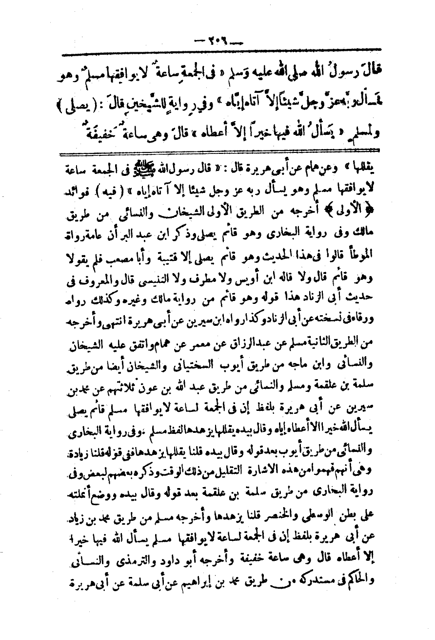 قَالَ رَسُولُ اللَّهِ - صَلَّى اللَّهُ عَلَيْهِ وَسَلَّمَ - «فِي الْجُمُعَةِ سَاعَةٌ لَا يُوَافِقُهَا مُسْلِمٌ وَهُوَ يَسْأَلُ اللَّهَ عَزَّ وَجَلَّ شَيْئًا إلَّا آتَاهُ إيَّاهُ» وَفِي رِوَايَةٍ لِلشَّيْخَيْنِ قَالَ: «يُصَلِّي» وَلِمُسْلِمٍ «يَسْأَلُ اللَّهَ فِيهَا خَيْرًا إلَّا أَعْطَاهُ» قَالَ وَهِيَ سَاعَةٌ خَفِيفَةٌ..