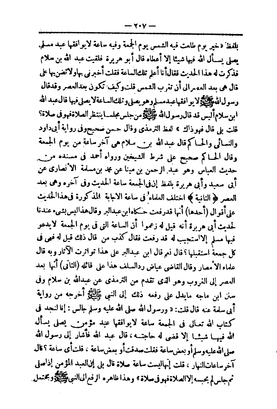 ـــــــــــــــــــــــــــــQبِلَفْظِ «خَيْرُ يَوْمٍ طَلَعَتْ فِيهِ الشَّمْسُ يَوْمُ الْجُمُعَةِ وَفِيهِ سَاعَةٌ لَا يُوَافِقُهَا عَبْدٌ مُسْلِمٌ يُصَلِّي يَسْأَلُ اللَّهَ فِيهَا شَيْئًا إلَّا أَعْطَاهُ» قَالَ أَبُو هُرَيْرَةَ فَلَقِيتُ عَبْدَ اللَّهِ بْنَ سَلَامٍ فَذَكَرْت لَهُ هَذَا الْحَدِيثَ فَقَالَ أَنَا أَعْلَمُ تِلْكَ السَّاعَةَ فَقُلْت أَخْبِرْنِي بِهَا وَلَا تَضِنَّ بِهَا عَلَيَّ قَالَ هِيَ بَعْدَ الْعَصْرِ إلَى أَنْ تَغْرُبَ الشَّمْسُ قُلْت وَكَيْفَ تَكُونُ بَعْدَ الْعَصْرِ وَقَدْ قَالَ رَسُولُ اللَّهِ - صَلَّى اللَّهُ عَلَيْهِ وَسَلَّمَ - لَا يُوَافِقُهَا عَبْدٌ مُسْلِمٌ وَهُوَ يُصَلِّي وَتِلْكَ السَّاعَةُ لَا يُصَلَّى فِيهَا قَالَ عَبْدُ اللَّهِ بْنُ سَلَامٍ أَلَيْسَ قَالَ رَسُولُ اللَّهِ - صَلَّى اللَّهُ عَلَيْهِ وَسَلَّمَ - «مَنْ جَلَسَ مَجْلِسًا يَنْتَظِرُ الصَّلَاةَ فَهُوَ فِي صَلَاةٍ» ؟ قُلْت بَلَى قَالَ فَهُوَ ذَاكَ " لَفْظُ التِّرْمِذِيِّ وَقَالَ حَسَنٌ صَحِيحٌ وَفِي رِوَايَةِ أَبِي دَاوُد وَالنَّسَائِيُّ وَالْحَاكِمِ قَالَ عَبْدُ اللَّهِ بْنُ سَلَامٍ هِيَ آخِرُ سَاعَةٍ مِنْ يَوْمِ الْجُمُعَةِ وَقَالَ الْحَاكِمُ صَحِيحٌ عَلَى شَرْطِ الشَّيْخَيْنِ وَرَوَاهُ أَحْمَدُ فِي مُسْنَدِهِ مِنْ حَدِيثِ الْعَبَّاسِ وَهُوَ عَبْدُ الرَّحْمَنِ بْنُ مِينَاءَ عَنْ مُحَمَّدِ بْنِ مَسْلَمَةً الْأَنْصَارِيُّ عَنْ أَبِي سَعِيدٍ وَأَبِي هُرَيْرَةَ بِلَفْظِ «إنَّ فِي الْجُمُعَةِ سَاعَةٌ» الْحَدِيثَ وَفِي آخِرِهِ «وَهِيَ بَعْدَ الْعَصْرِ» .