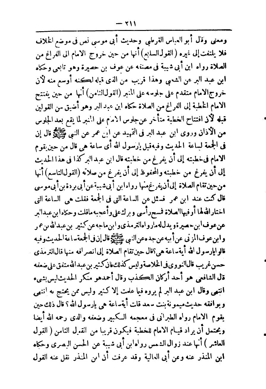 وَرَوَى ابْنُ عَبْدِ الْبَرِّ فِي التَّمْهِيدِ عَنْ ابْنِ عُمَرَ عَنْ النَّبِيِّ - صَلَّى اللَّهُ عَلَيْهِ وَسَلَّمَ - قَالَ: «إنَّ فِي الْجُمُعَةِ لَسَاعَةً» الْحَدِيثَ وَفِيهِ «قِيلَ يَا رَسُولَ اللَّهِ أَيُّ سَاعَةٍ هِيَ قَالَ مِنْ حِينِ يَقُومُ الْإِمَامُ فِي خُطْبَتِهِ إلَى أَنْ يَفْرُغَ مِنْ خُطْبَتِهِ» قَالَ ابْنُ عَبْدِ الْبَرِّ كَذَا فِي هَذَا الْحَدِيثِ إلَى أَنْ يَفْرُغَ مِنْ خُطْبَتِهِ وَالْمَحْفُوظُ إلَى أَنْ يَفْرُغَ مِنْ صَلَاتِهِ.