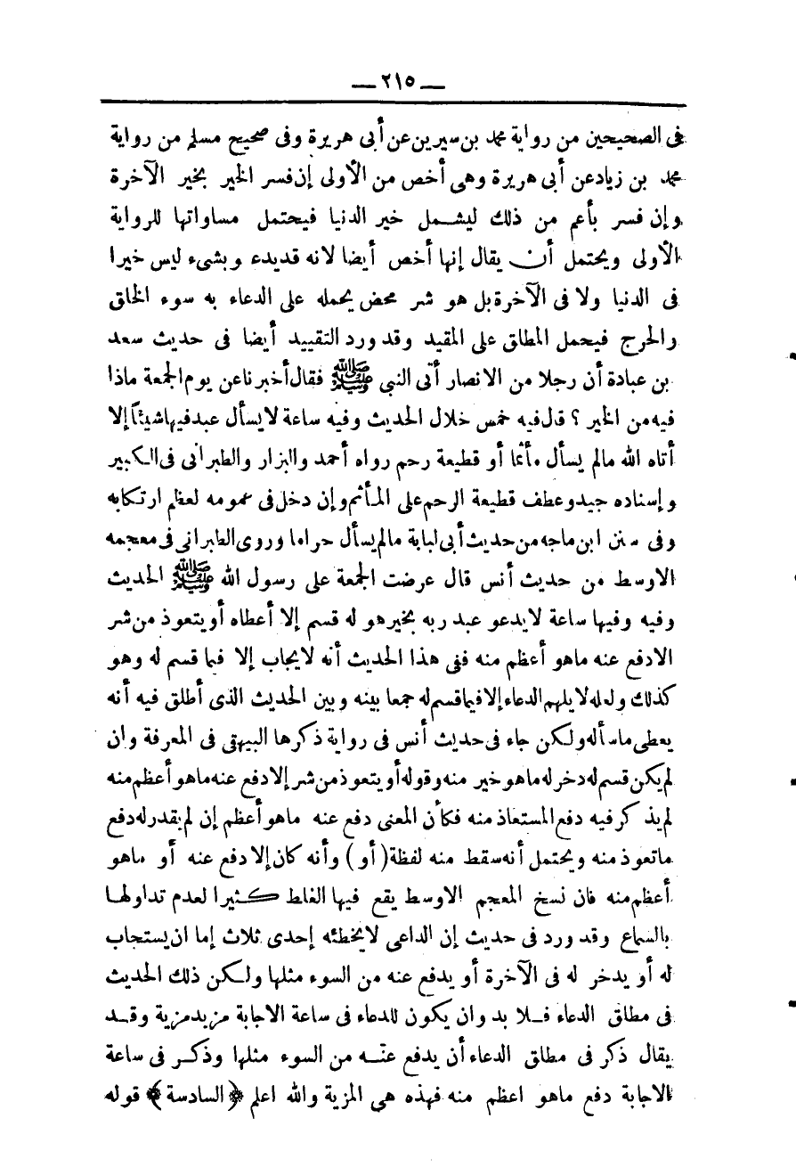 وَقَدْ وَرَدَ فِي حَدِيثِ «إنَّ الدَّاعِيَ لَا يُخْطِئُهُ إحْدَى ثَلَاثٍ إمَّا أَنْ يُسْتَجَابَ لَهُ أَوْ يُدَّخَرَ لَهُ فِي الْآخِرَةِ أَوْ يُدْفَعَ عَنْهُ مِنْ سُوءٍ مِثْلُهَا» وَلَكِنَّ ذَلِكَ الْحَدِيثَ فِي مُطْلَقِ الدُّعَاءِ فَلَا بُدَّ وَأَنْ يَكُونَ لِلدُّعَاءِ فِي سَاعَةِ الْإِجَابَةِ مَزِيدُ مَزِيَّةٍ وَقَدْ يُقَالُ ذُكِرَ فِي مُطْلَقِ الدُّعَاءِ أَنْ يُدْفَعَ عَنْهُ مِنْ السُّوءِ مِثْلُهَا وَذُكِرَ فِي سَاعَةِ الْإِجَابَةِ دَفْعُ مَا هُوَ أَعْظَمُ مِنْهُ فَهَذِهِ هِيَ الْمَزِيَّة وَاَللَّهُ أَعْلَمُ.