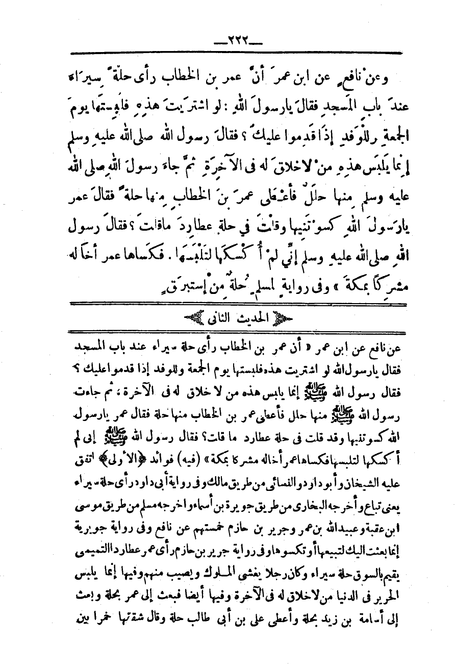 الْحَدِيثُ الثَّانِي عَنْ نَافِعٍ عَنْ ابْنِ عُمَرَ «أَنَّ عُمَرَ بْنَ الْخَطَّابِ رَأَى حُلَّةً سِيَرَاءَ عِنْدَ بَابِ الْمَسْجِدِ فَقَالَ يَا رَسُولَ اللَّهِ لَوْ اشْتَرَيْتَ هَذِهِ فَلَبِسْتَهَا يَوْمَ الْجُمُعَةِ، وَلِلْوَفْدِ إذَا قَدِمُوا عَلَيْك؟ فَقَالَ رَسُولُ اللَّهِ - صَلَّى اللَّهُ عَلَيْهِ وَسَلَّمَ - إنَّمَا يَلْبَسُ هَذِهِ مَنْ لَا خَلَاقَ لَهُ فِي الْآخِرَةِ، ثُمَّ جَاءَتْ رَسُولَ اللَّهِ - صَلَّى اللَّهُ عَلَيْهِ وَسَلَّمَ - مِنْهَا حُلَلٌ فَأَعْطَى عُمَرَ بْنَ الْخَطَّابِ مِنْهَا حُلَّةً فَقَالَ عُمَرُ يَا رَسُولَ اللَّهِ كَسَوْتَنِيهَا، وَقَدْ قُلْتَ فِي حُلَّةِ عُطَارِدَ مَا قُلْتَ؟ فَقَالَ رَسُولُ اللَّهِ - صَلَّى اللَّهُ عَلَيْهِ وَسَلَّمَ - إنِّي لَمْ أَكْسُكَهَا لِتَلْبَسَهَا فَكَسَاهَا عُمَرُ أَخًا لَهُ مُشْرِكًا بِمَكَّةَ» (فِيهِ) فَوَائِدُ: (الْأُولَى) اتَّفَقَ عَلَيْهِ الشَّيْخَانِ وَأَبُو دَاوُد، وَالنَّسَائِيُّ مِنْ طَرِيقِ مَالِكٍ، وَفِي رِوَايَةِ أَبِي دَاوُد «رَأَى حُلَّةً سِيَرَاءَ» يَعْنِي تُبَاعُ، وَأَخْرَجَهُ الْبُخَارِيُّ مِنْ طَرِيقِ جُوَيْرَةَ بْنِ أَسْمَاءَ، وَأَخْرَجَهُ مُسْلِمٌ مِنْ طَرِيقِ مُوسَى بْنِ عُقْبَةَ، وَعُبَيْدِ اللَّهِ بْنِ عُمَرَ وَجَرِيرُ بْنُ حَازِمٍ خَمْسَتُهُمْ عَنْ نَافِعٍ، وَفِي رِوَايَةِ جُوَيْرِيَةَ «إنَّمَا بَعَثْت إلَيْك لِتَبِيعَهَا أَوْ تَكْسُوَهَا» وَفِي رِوَايَةِ جَرِيرِ بْنِ حَازِمٍ «رَأَى عُمَرُ عُطَارِدَ التَّمِيمِيَّ يُقِيمُ بِالسُّوقِ حُلَّةً سِيَرَاءَ، وَكَانَ رَجُلًا يَغْشَى الْمُلُوكَ، وَيُصِيبُ مِنْهُمْ، وَفِيهَا إنَّمَا يَلْبَسُ الْحَرِيرَ فِي الدُّنْيَا مَنْ لَا خَلَاقَ لَهُ فِي الْآخِرَةِ، وَفِيهَا أَيْضًا فَبَعَثَ إلَى عُمَرَ بِحُلَّةٍ، وَبَعَثَ إلَى أُسَامَةَ بْنِ زَيْدٍ بِحُلَّةٍ، وَأَعْطَى عَلِيَّ بْنَ أَبِي طَالِبٍ حُلَّةً، وَقَالَ شَقَقْتهَا خُمُرًا بَيْنَ