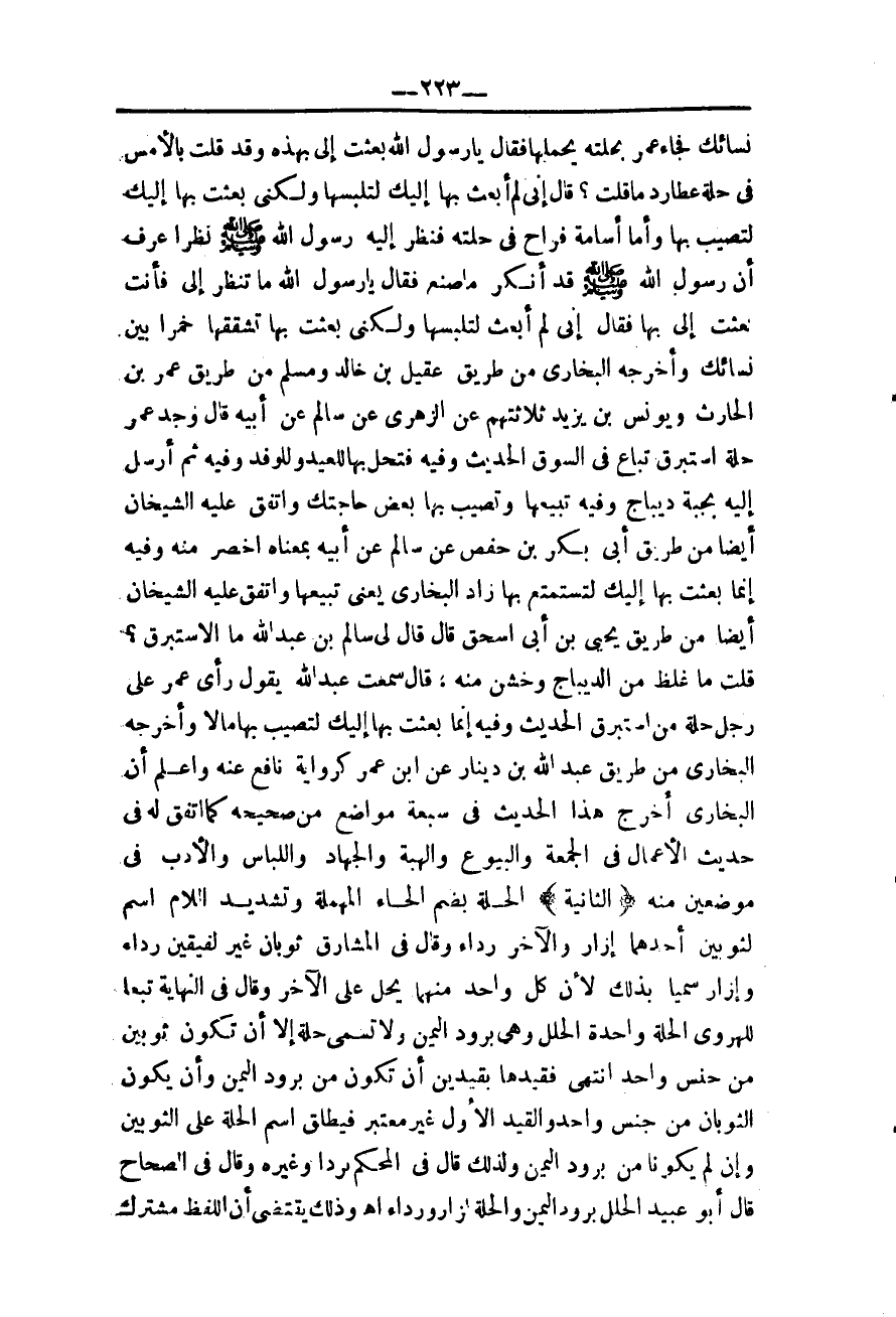 ـــــــــــــــــــــــــــــQنِسَائِك فَجَاءَ عُمَرُ بِحُلَّتِهِ يَحْمِلُهَا فَقَالَ يَا رَسُولَ اللَّهِ بَعَثْتَ إلَيَّ بِهَذِهِ، وَقَدْ قُلْتَ بِالْأَمْسِ فِي حُلَّةِ عُطَارِدَ مَا قُلْت؟ قَالَ إنِّي لَمْ أَبْعَثْ بِهَا إلَيْك لِتَلْبَسَهَا، وَلَكِنِّي بَعَثْت بِهَا إلَيْك لِتُصِيبَ بِهَا وَأَمَّا أُسَامَةُ فَرَاحَ فِي حُلَّتِهِ فَنَظَرَ إلَيْهِ رَسُولُ اللَّهِ - صَلَّى اللَّهُ عَلَيْهِ وَسَلَّمَ - نَظَرًا عَرَفَ أَنَّ رَسُولَ اللَّهِ - صَلَّى اللَّهُ عَلَيْهِ وَسَلَّمَ - قَدْ أَنْكَرَ مَا صَنَعَ فَقَالَ يَا رَسُولَ اللَّهِ مَا تَنْظُرُ إلَيَّ فَأَنْتَ بَعَثْتَ إلَيَّ بِهَا فَقَالَ إنِّي لَمْ أَبْعَثْ لِتَلْبَسَهَا، وَلَكِنِّي بَعَثْت بِهَا تَشَقُّقُهَا خُمُرًا بَيْنَ نِسَائِك» وَأَخْرَجَهُ الْبُخَارِيُّ مِنْ طَرِيقِ عُقَيْلِ بْنِ خَالِدٍ وَمُسْلِمٍ مِنْ طَرِيقِ عُمَرَ بْنِ الْحَارِثِ وَيُونُسَ بْنِ يَزِيدَ ثَلَاثَتُهُمْ عَنْ الزُّهْرِيِّ عَنْ سَالِمٍ عَنْ أَبِيهِ «قَالَ وَجَدَ عُمَرَ حُلَّةَ إسْتَبْرَقٍ تُبَاعُ فِي السُّوقِ» الْحَدِيثُ وَفِيهِ «فَتَحِلُّ بِهَا لِلْعِيدِ، وَلِلْوَفْدِ، وَفِيهِ ثُمَّ أَرْسَلَ إلَيْهِ بِجُبَّةِ دِيبَاجٍ، وَفِيهِ تَبِيعُهَا، وَتُصِيبُ بِهَا بَعْضَ حَاجَتِك» وَاتَّفَقَ عَلَيْهِ الشَّيْخَانِ أَيْضًا مِنْ طَرِيقِ أَبِي بَكْرِ بْنِ حَفْصٍ عَنْ سَالِمٍ عَنْ أَبِيهِ بِمَعْنَاهُ أَخْصَرَ مِنْهُ، وَفِيهِ «إنَّمَا بَعَثْت بِهَا إلَيْك لِتَسْتَمْتِعَ بِهَا» زَادَ الْبُخَارِيُّ يَعْنِي تَبِيعُهَا، وَاتَّفَقَ عَلَيْهِ الشَّيْخَانِ أَيْضًا مِنْ طَرِيقِ يَحْيَى بْنِ أَبِي إِسْحَاقَ قَالَ قَالَ لِي سَالِمُ بْنُ عَبْدِ اللَّهِ مَا الْإِسْتَبْرَقُ؟ قُلْتُ مَا غَلُظَ مِنْ الدِّيبَاجِ، وَخَشُنَ مِنْهُ، قَالَ سَمِعْت عَبْدَ اللَّهِ يَقُولُ رَأَى عُمَرُ عَلَى رَجُلٍ حُلَّةً مِنْ إسْتَبْرَقٍ الْحَدِيثَ، وَفِيهِ إنَّمَا بَعَثْت بِهَا إلَيْك لِتُصِيبَ بِهَا مَالًا وَأَخْرَجَهُ الْبُخَارِيُّ مِنْ طَرِيقِ عَبْدِ اللَّهِ بْنِ دِينَارٍ عَنْ ابْنِ عُمَرَ كَرِوَايَةِ نَافِعٍ عَنْهُ، وَاعْلَمْ أَنَّ الْبُخَارِيَّ أَخْرَجَ هَذَا الْحَدِيثَ فِي سَبْعَةِ مَوَاضِعَ مِنْ صَحِيحِهِ