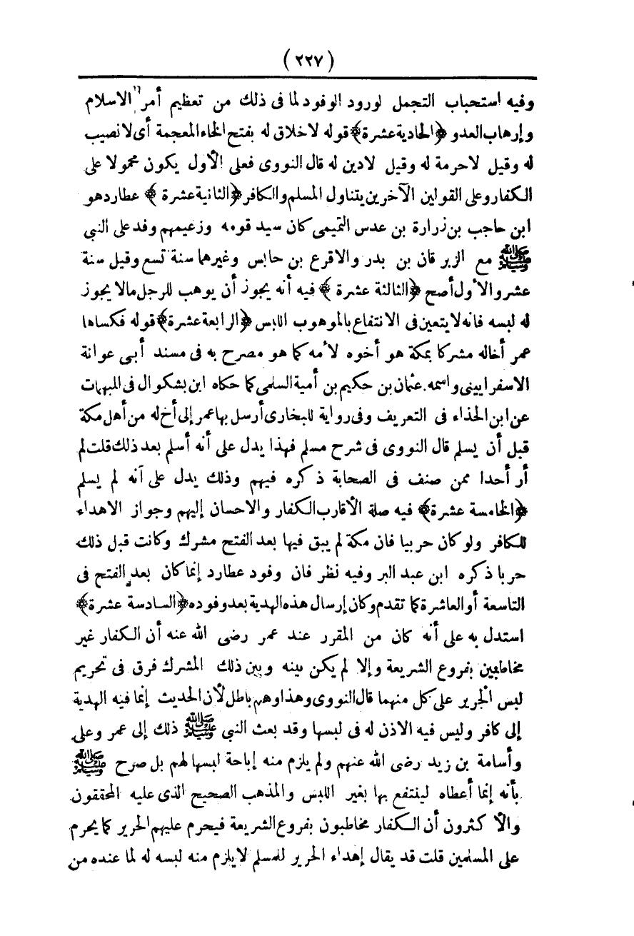 (السَّادِسَةَ عَشْرَةَ) اسْتَدَلَّ بِهِ عَلَى أَنَّهُ كَانَ مِنْ الْمُقَرَّرِ عِنْدَ عُمَرَ - رَضِيَ اللَّهُ عَنْهُ - أَنَّ الْكُفَّارَ غَيْرُ مُخَاطَبِينَ بِفُرُوعِ الشَّرِيعَةِ، وَإِلَّا لَمْ يَكُنْ بَيْنَهُ، وَبَيْنَ ذَلِكَ الْمُشْرِكِ فَرْقٌ فِي تَحْرِيمِ لُبْسِ الْحَرِيرِ عَلَى كُلٍّ مِنْهُمَا قَالَ النَّوَوِيُّ، وَهَذَا وَهْمٌ بَاطِلٌ لِأَنَّ الْحَدِيثَ إنَّمَا فِيهِ الْهَدِيَّةُ إلَى كَافِرٍ، وَلَيْسَ فِيهِ الْإِذْنُ لَهُ فِي لُبْسِهَا.