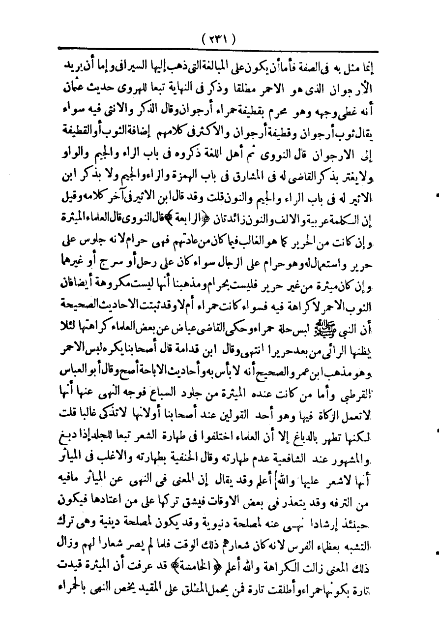 وَقَالَ ابْنُ قُدَامَةَ قَالَ أَصْحَابُنَا يُكْرَهُ لُبْسُ الْأَحْمَرِ، وَهُوَ مَذْهَبُ ابْنِ عُمَرَ، وَالصَّحِيحُ أَنَّهُ لَا بَأْسَ بِهِ، وَأَحَادِيثُ الْإِبَاحَةِ أَصَحُّ، وَقَالَ أَبُو الْعَبَّاسِ الْقُرْطُبِيُّ.