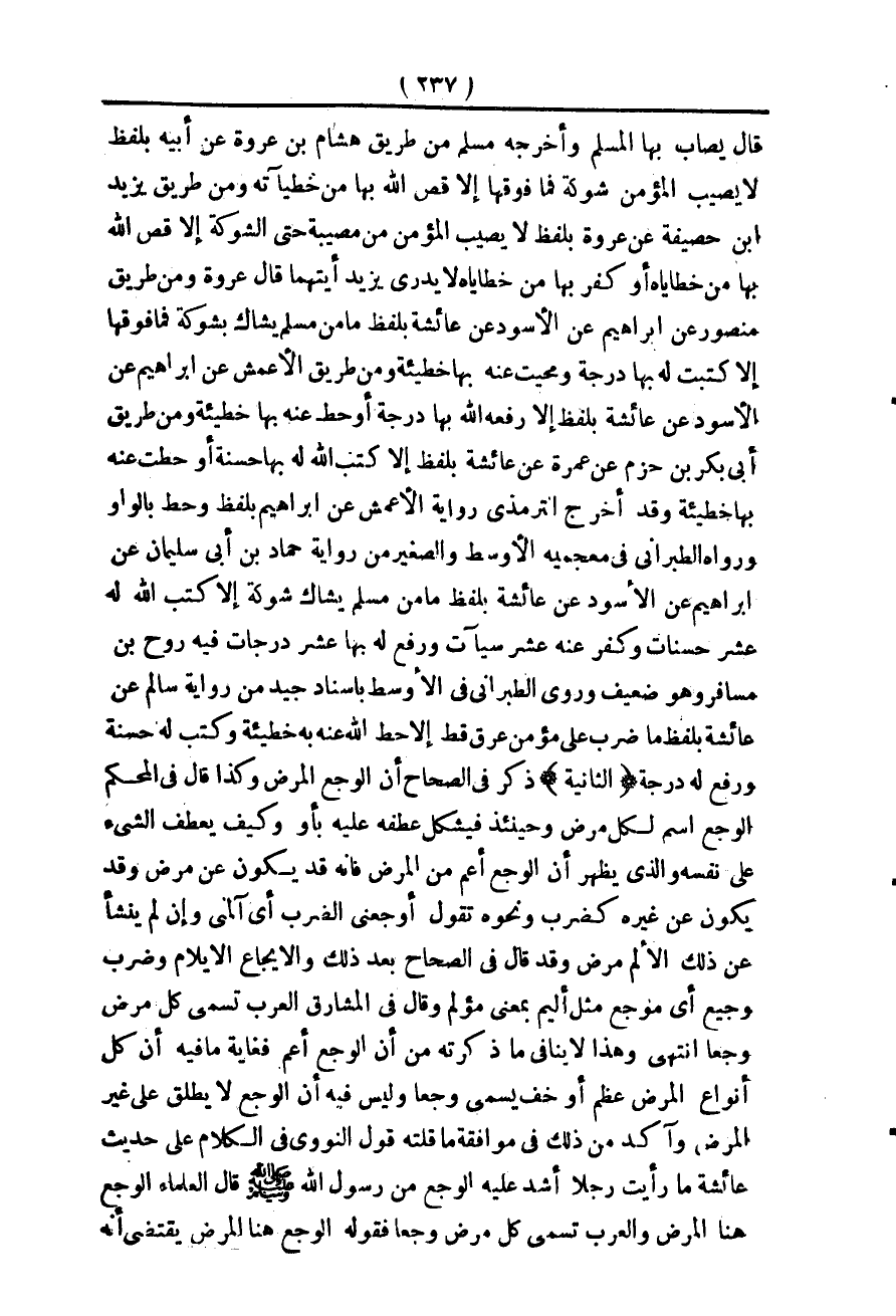 ـــــــــــــــــــــــــــــQ «قَالَ يُصَابُ بِهَا الْمُسْلِمُ» ، وَأَخْرَجَهُ مُسْلِمٌ مِنْ طَرِيقِ هِشَامِ بْنِ عُرْوَةَ عَنْ أَبِيهِ بِلَفْظِ «لَا يُصِيبُ الْمُؤْمِنَ شَوْكَةٌ فَمَا فَوْقَهَا إلَّا قَصَّ اللَّهُ بِهَا مِنْ خَطِيئَتِهِ» ، وَمِنْ طَرِيقِ يَزِيدَ بْنِ حَصِيفَةَ عَنْ عُرْوَةَ بِلَفْظٍ «لَا يُصِيبُ الْمُؤْمِنَ مِنْ مُصِيبَةٍ حَتَّى الشَّوْكَةُ إلَّا قَصَّ اللَّهُ بِهَا مِنْ خَطَايَاهُ أَوْ كَفَّرَ بِهَا مِنْ خَطَايَاهُ لَا يَدْرِي يَزِيدُ أَيَّتَهُمَا» قَالَ عُرْوَةُ، وَمِنْ طَرِيقِ مَنْصُورٍ عَنْ إبْرَاهِيمَ عَنْ الْأَسْوَدِ عَنْ عَائِشَةَ بِلَفْظِ «مَا مِنْ مُسْلِمٍ يُشَاكُ بِشَوْكَةٍ فَمَا فَوْقَهَا إلَّا كُتِبَتْ لَهُ بِهَا دَرَجَةٌ، وَمُحِيَتْ عَنْهُ بِهَا خَطِيئَةٌ» ، وَمِنْ طَرِيقِ الْأَعْمَشِ عَنْ إبْرَاهِيمَ عَنْ الْأَسْوَدِ عَنْ عَائِشَةَ بِلَفْظِ «إلَّا رَفَعَهُ اللَّهُ بِهَا دَرَجَةً أَوْ حَطَّ عَنْهُ بِهَا خَطِيئَةً» ، وَمِنْ طَرِيقِ أَبِي بَكْرِ بْنِ حَزْمٍ عَنْ عَمْرَةَ عَنْ عَائِشَةَ بِلَفْظِ «إلَّا كَتَبَ اللَّهُ لَهُ بِهَا حَسَنَةً أَوْ حُطَّتْ عَنْهُ بِهَا خَطِيئَةٌ» ، وَقَدْ أَخْرَجَ التِّرْمِذِيُّ رِوَايَةَ الْأَعْمَشِ عَنْ إبْرَاهِيمَ بِلَفْظِ، وَحَطَّ بِالْوَاوِ، وَرَوَاهُ الطَّبَرَانِيُّ فِي مُعْجَمَيْهِ الْأَوْسَطِ وَالصَّغِيرِ مِنْ رِوَايَةِ حَمَّادِ بْنِ أَبِي سُلَيْمَانَ عَنْ إبْرَاهِيمَ عَنْ الْأَسْوَدِ عَنْ عَائِشَةَ بِلَفْظِ «مَا مِنْ مُسْلِمٍ يُشَاكُ شَوْكَةً إلَّا كَتَبَ اللَّهُ لَهُ عَشْرَ حَسَنَاتٍ، وَكَفَّرَ عَنْهُ عَشْرَ سَيِّئَاتٍ، وَرَفَعَ لَهُ بِهَا عَشْرَ دَرَجَاتٍ» فِيهِ رَوْحُ بْنُ مُسَافِرٍ، وَهُوَ ضَعِيفٌ، وَرَوَى الطَّبَرَانِيُّ فِي الْأَوْسَطِ بِإِسْنَادٍ جَيِّدٍ مِنْ رِوَايَةِ سَالِمٍ عَنْ عَائِشَةَ بِلَفْظِ «مَا ضَرَبَ عَلَى مُؤْمِنٍ عِرْقٌ قَطُّ إلَّا حَطَّ اللَّهُ بِهِ خَطِيئَةً، وَكَتَبَ لَهُ حَسَنَةً، وَرَفَعَ لَهُ دَرَجَةً» .