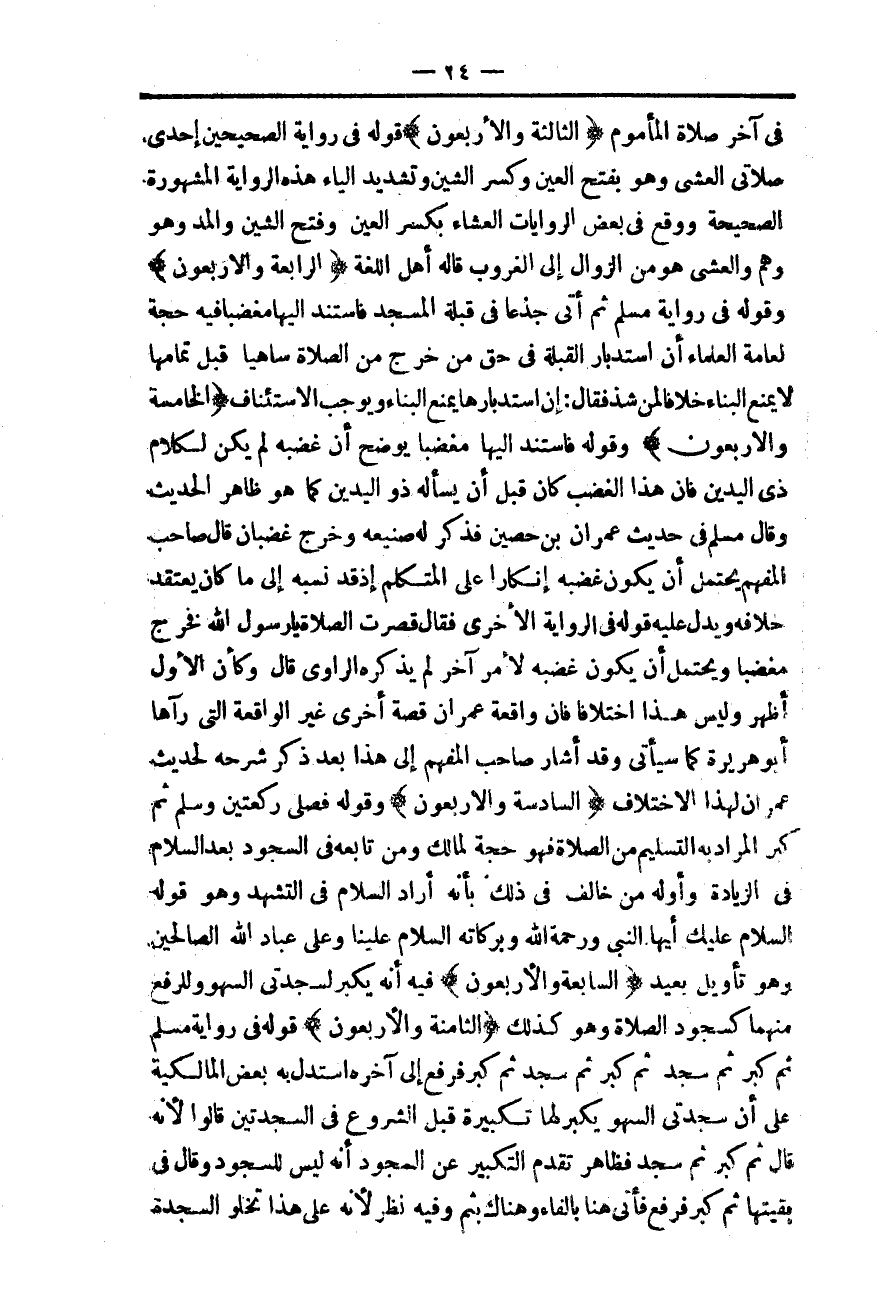 {الثَّالِثَةُ وَالْأَرْبَعُونَ} قَوْلُهُ فِي رِوَايَةِ الصَّحِيحَيْنِ إحْدَى صَلَاتَيْ الْعَشِيِّ وَهُوَ بِفَتْحِ الْعَيْنِ وَكَسْرِ الشِّينِ وَتَشْدِيدِ الْيَاءِ هَذِهِ الرِّوَايَةُ الْمَشْهُورَةُ الصَّحِيحَةُ وَوَقَعَ فِي بَعْضِ الرِّوَايَاتِ الْعِشَاءُ بِكَسْرِ الْعَيْنِ وَفَتْحِ الشِّينِ وَالْمَدِّ وَهُوَ وَهْمٌ وَالْعَشِيُّ هُوَ مِنْ الزَّوَالِ إلَى الْغُرُوبِ قَالَهُ أَهْلُ اللُّغَةِ.