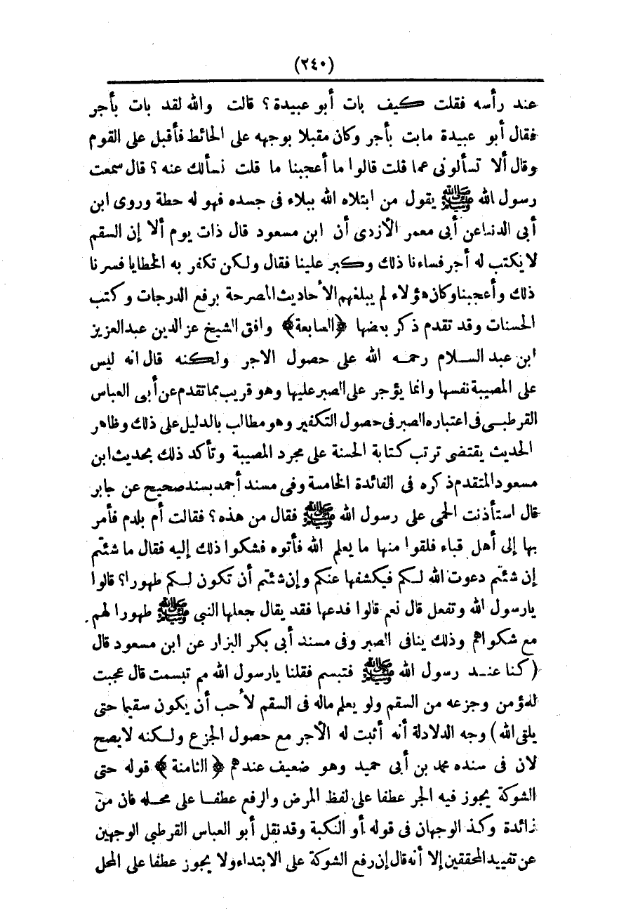 ـــــــــــــــــــــــــــــQعِنْدَ رَأْسِهِ فَقُلْت كَيْفَ بَاتَ أَبُو عُبَيْدَةَ؟ قَالَتْ، وَاَللَّهِ لَقَدْ بَاتَ بِأَجْرٍ فَقَالَ أَبُو عُبَيْدَةَ مَا بِتّ بِأَجْرٍ، وَكَانَ مُقْبِلًا بِوَجْهِهِ عَلَى الْحَائِطِ فَأَقْبَلَ عَلَى الْقَوْمِ، وَقَالَ أَلَا تَسْأَلُونِي عَمَّا قُلْتُ قَالُوا مَا أَعْجَبَنَا مَا قُلْتَ نَسْأَلُك عَنْهُ؟ قَالَ سَمِعْتُ رَسُولَ اللَّهِ - صَلَّى اللَّهُ عَلَيْهِ وَسَلَّمَ - يَقُولُ مَنْ ابْتَلَاهُ اللَّهُ بِبَلَاءٍ فِي جَسَدِهِ فَهُوَ لَهُ حِطَّةٌ» ، وَرَوَى ابْنُ أَبِي الدُّنْيَا عَنْ أَبِي مَعْمَرٍ الْأَزْدِيِّ أَنَّ ابْنَ مَسْعُودٍ قَالَ ذَاتَ يَوْمٍ أَلَا إنَّ السُّقْمَ لَا يُكْتَبُ لَهُ أَجْرٌ فَسَاءَنَا ذَلِكَ، وَكَبُرَ عَلَيْنَا فَقَالَ، وَلَكِنْ تُكَفَّرُ بِهِ الْخَطَايَا فَسَرَّنَا ذَلِكَ وَأَعْجَبَنَا، وَكَانَ هَؤُلَاءِ لَمْ يَبْلُغْهُمْ الْأَحَادِيثُ الْمُصَرِّحَة بِرَفْعِ الدَّرَجَاتِ، وَكَتْبِ الْحَسَنَاتِ، وَقَدْ تَقَدَّمَ ذِكْرُ بَعْضِهَا.