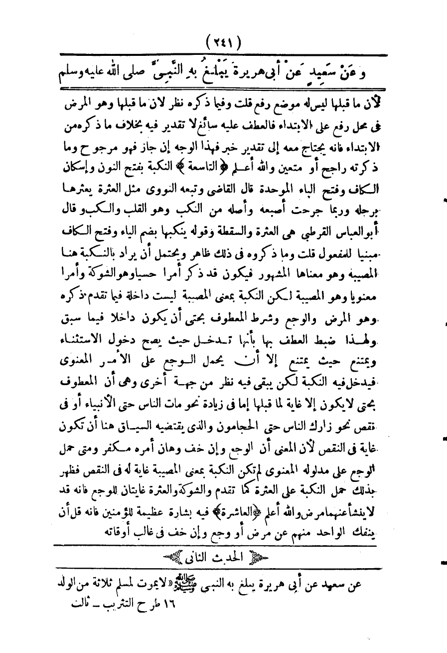(الْحَدِيثُ الثَّانِي) عَنْ سَعِيدٍ عَنْ أَبِي هُرَيْرَةَ بَلَغَ بِهِ النَّبِيَّ - صَلَّى اللَّهُ عَلَيْهِ وَسَلَّمَ - «لَا يَمُوتُ لِمُسْلِمٍ ثَلَاثَةٌ مِنْ الْوَلَدِ