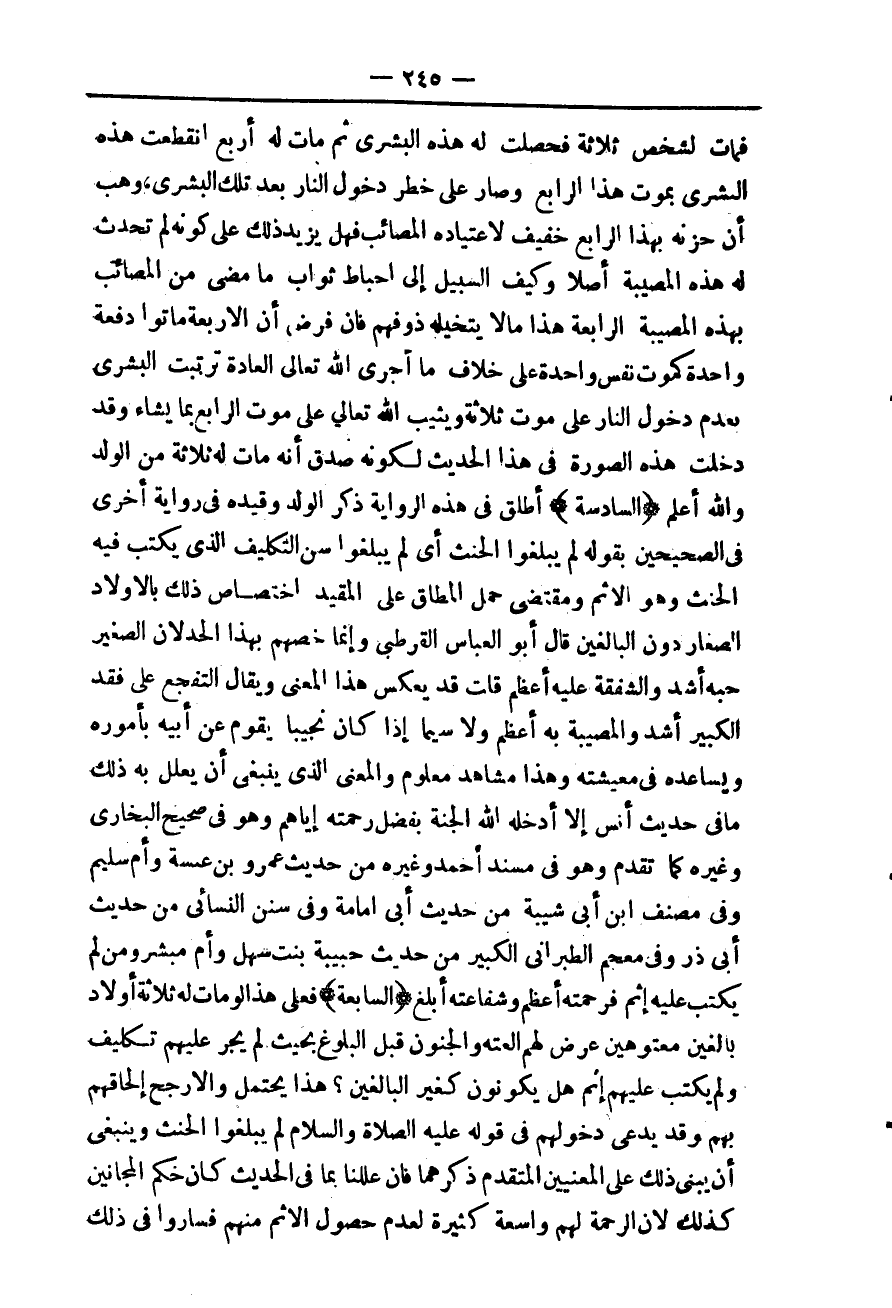 ـــــــــــــــــــــــــــــQفَمَاتَ لِشَخْصٍ ثَلَاثَةٌ فَحَصَلَتْ لَهُ هَذِهِ الْبُشْرَى ثُمَّ مَاتَ لَهُ أَرْبَعُ انْقَطَعَتْ هَذِهِ الْبُشْرَى بِمَوْتِ هَذَا الرَّابِعِ، وَصَارَ عَلَى خَطَرٍ دُخُولُهُ النَّارَ بَعْدَ تِلْكَ الْبُشْرَى، وَهَبَ أَنَّ حُزْنَهُ بِهَذَا الرَّابِعِ خَفِيفٌ لِاعْتِيَادِهِ الْمَصَائِبَ فَهَلْ يَزِيدُ ذَلِكَ عَلَى كَوْنِهِ لَمْ تَحْدُثْ لَهُ هَذِهِ الْمُصِيبَةُ أَصْلًا، وَكَيْفَ السَّبِيلُ إلَى إحْبَاطِ ثَوَابِ مَا مَضَى مِنْ الْمَصَائِبِ بِهَذِهِ الْمُصِيبَةِ الرَّابِعَةِ هَذَا مَا لَا يَتَخَيَّلُهُ ذُو فَهْمٍ فَإِنْ فُرِضَ أَنَّ الْأَرْبَعَةَ مَاتُوا دَفْعَةً وَاحِدَةً كَمَوْتِ نَفْسٍ وَاحِدَةٍ عَلَى خِلَافِ مَا أَجْرَى اللَّهُ تَعَالَى الْعَادَةَ تَرَتَّبَتْ الْبُشْرَى بِعَدَمِ دُخُولِ النَّارِ عَلَى مَوْتِ ثَلَاثَةٍ، وَيُثِيبُ اللَّهُ تَعَالَى عَلَى مَوْتِ الرَّابِعِ بِمَا يَشَاءُ، وَقَدْ دَخَلَتْ هَذِهِ الصُّورَةُ فِي هَذَا الْحَدِيثِ لِكَوْنِهِ صَدَقَ أَنَّهُ مَاتَ لَهُ ثَلَاثَةٌ مِنْ الْوَلَدِ، وَاَللَّهُ أَعْلَمُ.
