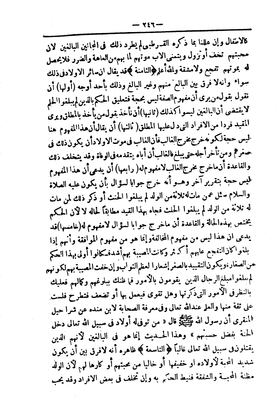 (الثَّامِنَةُ) قَدْ يُقَالُ إنَّ سَائِرَ الْأَوْلَادِ فِي ذَلِكَ سَوَاءٌ، وَإِنَّهُ لَا فَرْقَ بَيْنَ الْبَالِغِ مِنْهُمْ، وَغَيْرِ الْبَالِغِ، وَذَلِكَ بِأَحَدِ أَوْجُهٍ (أَوَّلُهَا) أَنْ نَقُولَ بِقَوْلِ مَنْ يَرَى أَنَّ مَفْهُومَ الصِّفَةِ لَيْسَ بِحُجَّةٍ فَتَعْلِيقُ الْحُكْمِ بِاَلَّذِينَ لَمْ يَبْلُغُوا الْحُلُمَ لَا يُقْتَضَى أَنَّ الْبَالِغِينَ لَيْسُوا كَذَلِكَ (ثَانِيهَا) أَنْ نَأْخُذَ بِقَوْلِ مَنْ يَأْخُذُ بِالْمُطْلَقِ، وَيَرَى الْمُقَيَّدَ فَرْدًا مِنْ الْأَفْرَادِ الَّتِي دَلَّ عَلَيْهَا الْمُطْلَقُ (ثَالِثُهَا) أَنْ يُقَالَ أَنَّ هَذَا الْمَفْهُومَ هُنَا لَيْسَ حُجَّةً لِكَوْنِهِ خَرَجَ مَخْرَجَ الْغَالِبِ فَإِنَّ الْغَالِبَ فِي مَوْتِ الْأَوْلَادِ أَنْ يَكُونَ ذَلِكَ فِي صِغَرِهِمْ، وَمَنْ تَأَخَّرَ أَجَلُهُ حَتَّى يَبْلُغَ فَالْغَالِبُ أَنَّ أَبَاهُ يَتَقَدَّمُهُ فِي الْوَفَاةِ، وَقَدْ يَتَخَلَّفُ ذَلِكَ، وَالْقَاعِدَةُ أَنْ مَا خَرَجَ مَخْرَجَ الْغَالِبِ لَا مَفْهُومَ لَهُ (رَابِعُهَا) أَنْ يَدَّعِيَ أَنَّ هَذَا الْمَفْهُومَ لَيْسَ حُجَّةً بِتَقْرِيرٍ آخَرَ، وَهُوَ أَنَّهُ خَرَجَ جَوَابًا لِسُؤَالِ بِأَنْ يَكُونَ - عَلَيْهِ الصَّلَاةُ وَالسَّلَامُ - سُئِلَ عَمَّنْ مَاتَ لَهُ ثَلَاثَةٌ مِنْ الْوَلَدِ لَمْ يَبْلُغُوا الْحِنْثَ أَوْ ذَكَرَ ذَلِكَ لِمَنْ مَاتَ لَهُ ثَلَاثَةٌ مِنْ الْوَلَدِ لَمْ يَبْلُغُوا الْحِنْثَ فَجَاءَ بِهَذَا الْقَيْدِ مُطَابِقًا لِحَالِهِ لَا لِأَنَّ الْحُكْمَ يَخْتَصُّ بِهَذِهِ الْحَالَةِ، وَالْقَاعِدَةُ أَنَّ مَا خَرَجَ جَوَابًا لِسُؤَالٍ لَا مَفْهُومَ لَهُ (خَامِسُهَا) قَدْ يَدَّعِي أَنَّ هَذَا لَيْسَ مِنْ مَفْهُومِ الْمُخَالَفَةِ، وَإِنَّمَا هُوَ مِنْ مَفْهُومِ الْمُوَافَقَةِ، وَأَنَّهُمْ إذَا بَلَغُوا كَانَ التَّفَجُّعُ عَلَيْهِمْ أَكْثَرُ، وَكَانَتْ الْمُصِيبَةُ بِهِمْ أَشَدَّ فَكَانُوا أَوْلَى بِهَذَا الْحُكْمِ مِنْ الصِّغَارِ، وَيَكُونُ التَّقْيِيدُ بِالصِّغَرِ إشْعَارًا لَعِظَمِ الثَّوَابِ، وَإِنْ خَفَّتْ الْمُصِيبَةُ بِهِمْ لِكَوْنِهِمْ لَمْ يَبْلُغُوا مَبْلَغَ الرِّجَالِ الَّذِينَ يَقُومُونَ بِالْأُمُورِ فَمَا ظَنُّك بِبُلُوغِهِمْ، وَكَمَالِهِمْ فَعَلَيْك بِالنَّظَرِ فِي الْأُمُورِ الَّتِي ذَكَرْتهَا، وَهَلْ تَقْوَى فَيُعْمَلُ بِهَا أَوْ تَضْعُفُ فَتَطْرَحُ فَلَسْت عَلَى ثِقَةٍ مِنْهَا، وَالْعِلْمُ عِنْدَ اللَّهِ تَعَالَى، وَفِي مَعْرِفَةِ الصَّحَابَةِ لِابْنِ مَنْدَهْ عَنْ شَرَاحِيلَ الْمُنْقِرِيُّ أَنَّ رَسُولَ اللَّهِ - صَلَّى اللَّهُ عَلَيْهِ وَسَلَّمَ - قَالَ «مَنْ تُوُفِّيَ لَهُ أَوْلَادٌ فِي سَبِيلِ اللَّهِ تَعَالَى دَخَلَ الْجَنَّةَ بِفَضْلِ حِسْبَتِهِمْ» ، وَهَذَا الْحَدِيثُ إنَّمَا هُوَ فِي الْبَالِغِينَ لِأَنَّهُمْ الَّذِينَ يُقْتَلُونَ فِي سَبِيلِ اللَّهِ تَعَالَى غَالِبًا.