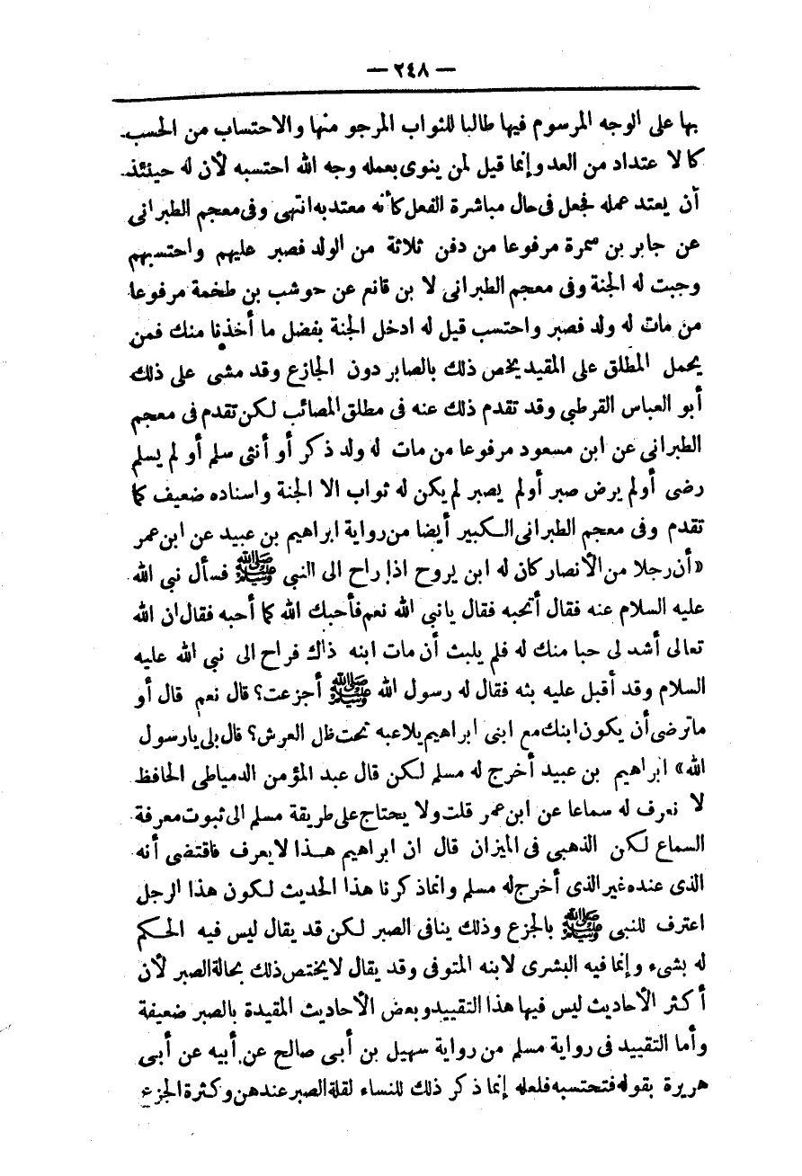 وَفِي مُعْجَمِ الطَّبَرَانِيِّ الْكَبِيرِ أَيْضًا مِنْ رِوَايَةِ إبْرَاهِيمَ بْنِ عُبَيْدٍ عَنْ ابْنِ عُمَرَ «أَنَّ رَجُلًا مِنْ الْأَنْصَارِ كَانَ لَهُ ابْنٌ يَرُوحُ إذَا رَاحَ إلَى النَّبِيِّ - صَلَّى اللَّهُ عَلَيْهِ وَسَلَّمَ - فَسَأَلَ نَبِيُّ اللَّهِ - عَلَيْهِ السَّلَامُ - عَنْهُ فَقَالَ أَتُحِبُّهُ فَقَالَ يَا نَبِيَّ اللَّهِ نَعَمْ فَأَحَبَّك اللَّهُ كَمَا أُحِبُّهُ فَقَالَ إنَّ اللَّهَ تَعَالَى أَشَدُّ لِي حُبًّا مِنْك لَهُ فَلَمْ يَلْبَثْ أَنْ مَاتَ ابْنُهُ ذَاكَ فَرَاحَ إلَى نَبِيِّ اللَّهِ - عَلَيْهِ السَّلَامُ -، وَقَدْ أَقْبَلَ عَلَيْهِ بَثُّهُ فَقَالَ لَهُ رَسُولُ اللَّهِ - صَلَّى اللَّهُ عَلَيْهِ وَسَلَّمَ - أَجَزِعْت؟ قَالَ نَعَمْ قَالَ أَوَ مَا تَرْضَى أَنْ يَكُونَ ابْنُك مَعَ ابْنِي إبْرَاهِيمَ يُلَاعِبُهُ تَحْتَ ظِلِّ الْعَرْشِ؟ قَالَ بَلَى يَا رَسُولَ اللَّهِ» إبْرَاهِيمُ بْنُ عُبَيْدٍ أَخْرَجَ لَهُ مُسْلِمٌ لَكِنْ قَالَ عَبْدُ الْمُؤْمِنِ الدِّمْيَاطِيُّ الْحَافِظُ لَا نَعْرِفُ لَهُ سَمَاعًا عَنْ ابْنِ عُمَرَ قُلْت، وَلَا يَحْتَاجُ عَلَى طَرِيقَةِ مُسْلِمٍ إلَى ثُبُوتِ مَعْرِفَةِ السَّمَاعِ لَكِنَّ الذَّهَبِيُّ فِي الْمِيزَانِ قَالَ إنَّ إبْرَاهِيمَ هَذَا لَا يُعْرَفُ فَاقْتَضَى أَنَّهُ الَّذِي عِنْدَهُ غَيْرُ الَّذِي أَخْرَجَ لَهُ مُسْلِمٌ.