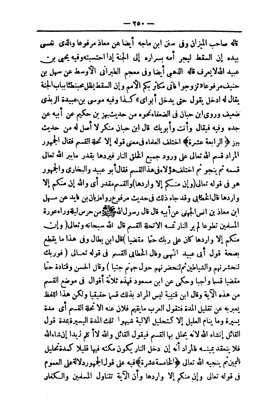 (الرَّابِعَةَ عَشْرَةَ) اخْتَلَفَ الْعُلَمَاءُ فِي مَعْنَى قَوْلِهِ إلَّا تَحِلَّةَ الْقَسَمِ فَقَالَ الْجُمْهُورُ الْمُرَادُ قَسَمُ اللَّهِ تَعَالَى عَلَى وُرُودِ جَمِيعِ الْخَلْقِ النَّارَ فَيَرِدُهَا بِقَدْرِ مَا يَبَرُّ اللَّهُ تَعَالَى قَسَمَهُ ثُمَّ يَنْجُو ثُمَّ اخْتَلَفَ هَؤُلَاءِ فِي هَذَا الْقَسَمِ فَقَالَ أَبُو عُبَيْدٍ، وَالْبُخَارِيُّ، وَالْجُمْهُورُ هُوَ فِي قَوْله تَعَالَى {وَإِنْ مِنْكُمْ إِلا وَارِدُهَا} [مريم: 71] ، وَالْقَسَمُ مُقَدَّرٌ أَيْ، وَاَللَّهِ إنْ مِنْكُمْ إلَّا وَارِدُهَا قَالَ الْخَطَّابِيُّ: وَقَدْ جَاءَ ذَلِكَ فِي حَدِيثٍ مَرْفُوعٍ رَوَاهُ زَبَّانُ بْنُ فَايِدٍ عَنْ سَهْلِ بْنِ مُعَاذِ بْنِ أَنَسٍ الْجُهَنِيِّ عَنْ أَبِيهِ قَالَ قَالَ رَسُولُ اللَّهِ - صَلَّى اللَّهُ عَلَيْهِ وَسَلَّمَ - «مَنْ حَرَسَ لَيْلَةً وَرَاءَ عَوْرَةِ الْمُسْلِمِينَ تَطَوُّعًا لَمْ يَرَ النَّارَ تَمَسُّهُ إلَّا تَحِلَّةَ الْقَسَمِ» قَالَ اللَّهُ سُبْحَانَهُ وَتَعَالَى {وَإِنْ مِنْكُمْ إِلا وَارِدُهَا كَانَ عَلَى رَبِّكَ حَتْمًا مَقْضِيًّا} [مريم: 71] قَالَ ابْنُ بَطَّالٍ، وَفِي هَذَا مَا يَقْطَعُ بِصِحَّةِ قَوْلِ أَبِي عُبَيْدٍ انْتَهَى.