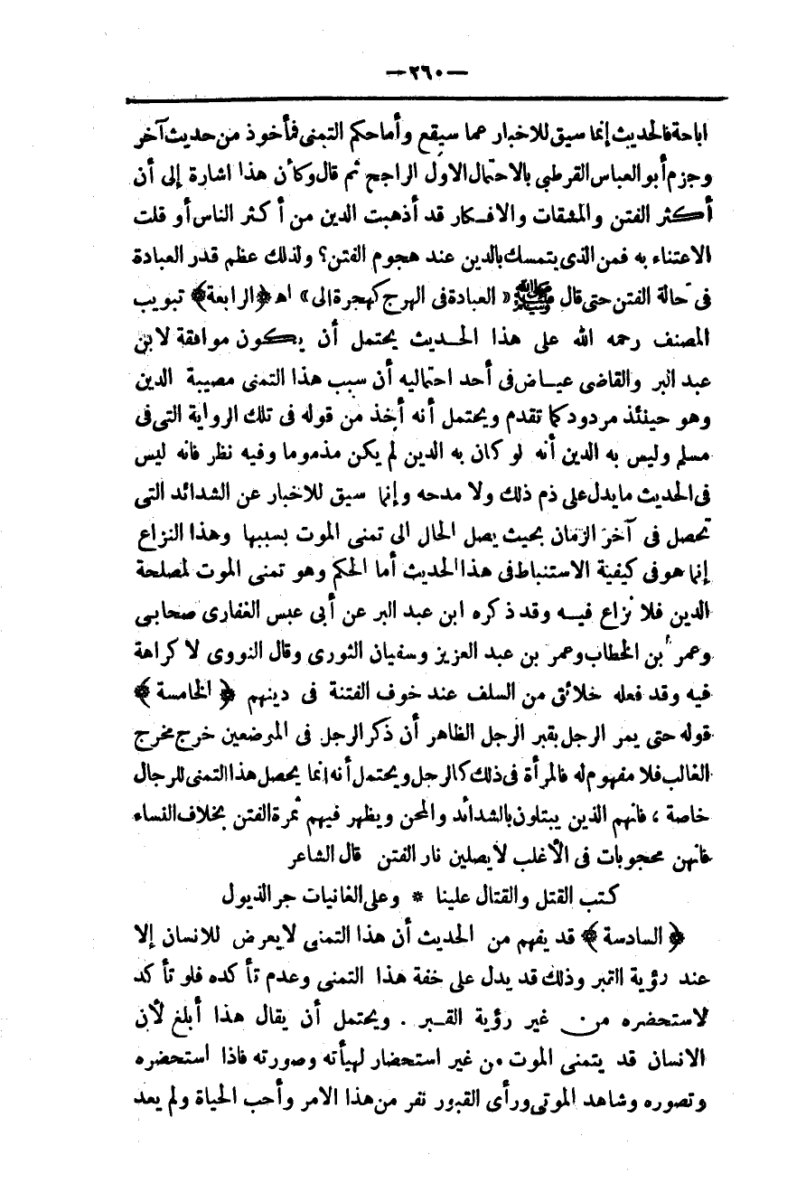وَأَمَّا حُكْمُ التَّمَنِّي فَمَأْخُوذٌ مِنْ حَدِيثٍ آخَرَ، وَجَزَمَ أَبُو الْعَبَّاسِ الْقُرْطُبِيُّ بِالِاحْتِمَالِ الْأَوَّلِ الرَّاجِحِ ثُمَّ قَالَ، وَكَأَنَّ هَذَا إشَارَةٌ إلَى أَنَّ أَكْثَرَ الْفِتَنِ وَالْمَشَقَّاتِ وَالْأَفْكَارِ قَدْ أَذْهَبَتْ الدِّينَ مِنْ أَكْثَرِ النَّاسِ أَوْ أَقَلَّتْ الِاعْتِنَاءَ بِهِ فَمَنْ يَتَمَسَّكُ بِالدِّينِ عِنْدَ هُجُومِ الْفِتَنِ؟ وَلِذَلِكَ عَظُمَ قَدْرُ الْعِبَادَةِ فِي حَالَةِ الْفِتَنِ حَتَّى قَالَ - صَلَّى اللَّهُ عَلَيْهِ وَسَلَّمَ - «الْعِبَادَةُ فِي الْهَرْجِ كَهِجْرَةٍ إلَيَّ» اهـ.