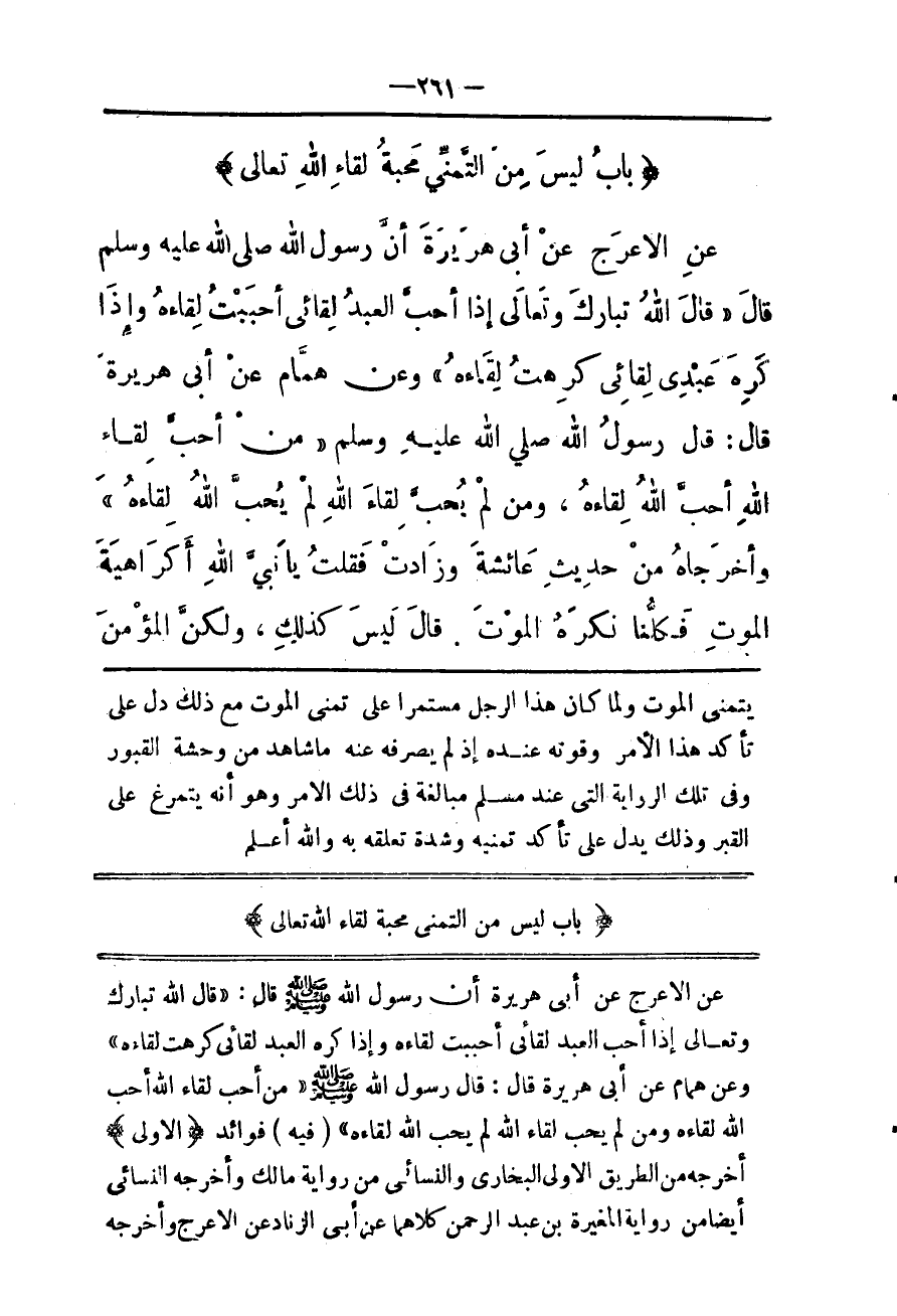 {بَابُ لَيْسَ مِنْ التَّمَنِّي مَحَبَّةُ لِقَاءِ اللَّهِ} عَنْ الْأَعْرَجِ عَنْ أَبِي هُرَيْرَةَ أَنَّ رَسُولَ اللَّهِ - صَلَّى اللَّهُ عَلَيْهِ وَسَلَّمَ - قَالَ: " قَالَ اللَّهُ تَبَارَكَ وَتَعَالَى إذَا أَحَبَّ الْعَبْدُ لِقَائِي أَحْبَبْت لِقَاءَهُ وَإِذَا كَرِهَ الْعَبْدُ لِقَائِي كَرِهْت لِقَاءَهُ " وَعَنْ هَمَّامٍ عَنْ أَبِي هُرَيْرَةَ قَالَ: قَالَ رَسُولُ اللَّهِ - صَلَّى اللَّهُ عَلَيْهِ وَسَلَّمَ - «مَنْ أَحَبَّ لِقَاءَ اللَّهِ أَحَبَّ اللَّهُ لِقَاءَهُ وَمَنْ لَمْ يُحِبَّ لِقَاءَ اللَّهِ لَمْ يُحِبَّ اللَّهُ لِقَاءَهُ» (فِيهِ) فَوَائِدُ: {الْأُولَى} أَخْرَجَهُ مِنْ الطَّرِيقِ الْأُولَى الْبُخَارِيُّ وَالنَّسَائِيُّ مِنْ رِوَايَةِ مَالِكٍ وَأَخْرَجَهُ النَّسَائِيّ أَيْضًا مِنْ رِوَايَةِ الْمُغِيرَةِ بْنِ عَبْدِ الرَّحْمَنِ كِلَاهُمَا عَنْ أَبِي الزِّنَادِ عَنْ الْأَعْرَجِ وَأَخْرَجَهُ