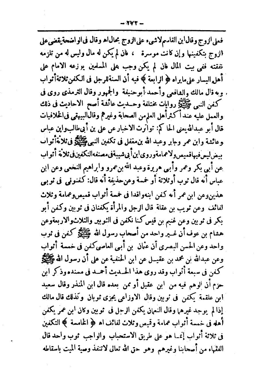 {الْخَامِسَةُ} التَّكْفِينُ فِي ثَلَاثَةِ أَثْوَابٍ إنَّمَا هُوَ عَلَى طَرِيقِ الِاسْتِحْبَابِ وَالْوَاجِبُ ثَوْبٌ وَاحِدٌ قَالَ الْفُقَهَاءُ مِنْ أَصْحَابِنَا وَغَيْرِهِمْ وَهُوَ حَقُّ اللَّهِ تَعَالَى لَا تَنْفُذُ وَصِيَّةُ الْمَيِّتِ بِإِسْقَاطِهِ