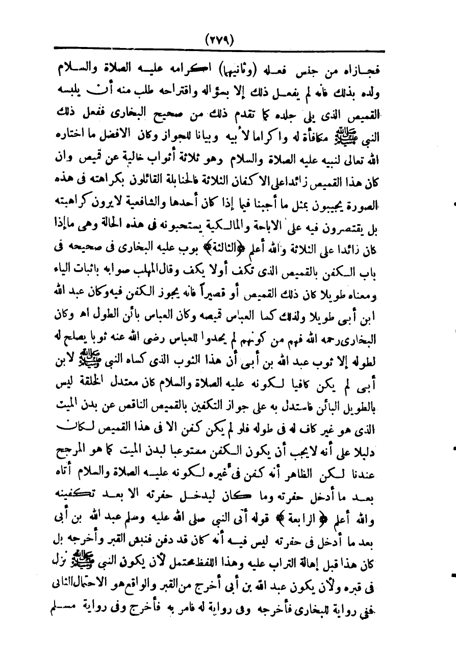ـــــــــــــــــــــــــــــQفَجَازَاهُ مِنْ جِنْسِ فِعْلِهِ (وَثَانِيهِمَا) إكْرَامُهُ - عَلَيْهِ الصَّلَاةُ وَالسَّلَامُ - وَلَدَهُ بِذَلِكَ فَإِنَّهُ لَمْ يَفْعَلْ ذَلِكَ إلَّا بِسُؤَالِهِ وَاقْتِرَاحِهِ طَلَبَ مِنْهُ أَنْ يُلْبِسَهُ الْقَمِيصَ الَّذِي يَلِي جِلْدَهُ كَمَا تَقَدَّمَ ذَلِكَ مِنْ صَحِيحِ الْبُخَارِيِّ فَفَعَلَ ذَلِكَ النَّبِيُّ - صَلَّى اللَّهُ عَلَيْهِ وَسَلَّمَ - مُكَافَأَةً لَهُ وَإِكْرَامًا لِأَبِيهِ وَبَيَانًا لِلْجَوَازِ وَكَانَ الْأَفْضَلُ مَا اخْتَارَهُ اللَّهُ تَعَالَى لِنَبِيِّهِ - عَلَيْهِ الصَّلَاةُ وَالسَّلَامُ - وَهُوَ ثَلَاثَةُ أَثْوَابٍ خَالِيَةٍ عَنْ قَمِيصٍ وَإِنْ كَانَ هَذَا الْقَمِيصُ زَائِدًا عَلَى الْأَكْفَانِ الثَّلَاثَةِ فَالْحَنَابِلَةُ الْقَائِلُونَ بِكَرَاهَتِهِ فِي هَذِهِ الصُّورَةِ يُجِيبُونَ بِمِثْلِ مَا أَجَبْنَا فِيمَا إذَا كَانَ أَحَدُهَا وَالشَّافِعِيَّةُ لَا يَرَوْنَ كَرَاهِيَتَهُ بَلْ يَقْتَصِرُونَ فِيهِ عَلَى الْإِبَاحَةِ وَالْمَالِكِيَّةُ يَسْتَحِبُّونَهُ فِي هَذِهِ الْحَالَةِ وَهِيَ مَا إذَا كَانَ زَائِدًا عَلَى الثَّلَاثَةِ وَاَللَّهُ أَعْلَمُ.