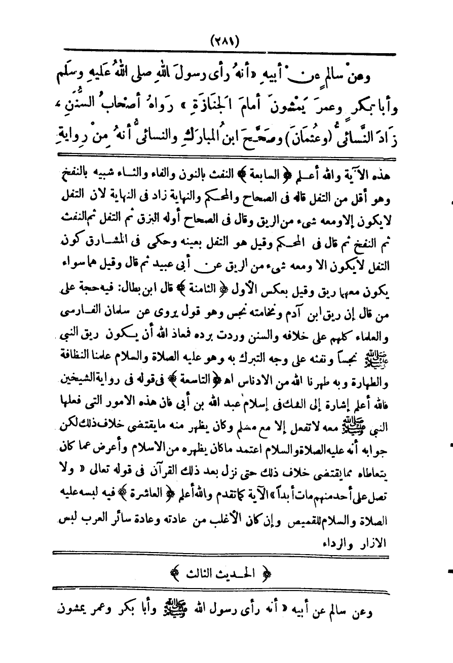 {الْحَدِيثَ الثَّالِثُ} وَعَنْ سَالِمٍ عَنْ أَبِيهِ أَنَّهُ «رَأَى رَسُولَ اللَّهِ - صَلَّى اللَّهُ عَلَيْهِ وَسَلَّمَ - وَأَبَا بَكْرٍ وَعُمَرَ يَمْشُونَ