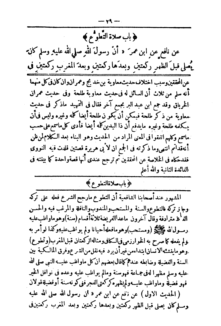 (الْحَدِيثُ الْأَوَّلُ) عَنْ نَافِعٍ عَنْ ابْنِ عُمَرَ «أَنَّ رَسُولَ اللَّهِ - صَلَّى اللَّهُ عَلَيْهِ وَسَلَّمَ - كَانَ يُصَلِّي قَبْلَ الظُّهْرِ رَكْعَتَيْنِ وَبَعْدَهَا رَكْعَتَيْنِ وَبَعْدَ الْمَغْرِبِ رَكْعَتَيْنِ فِي