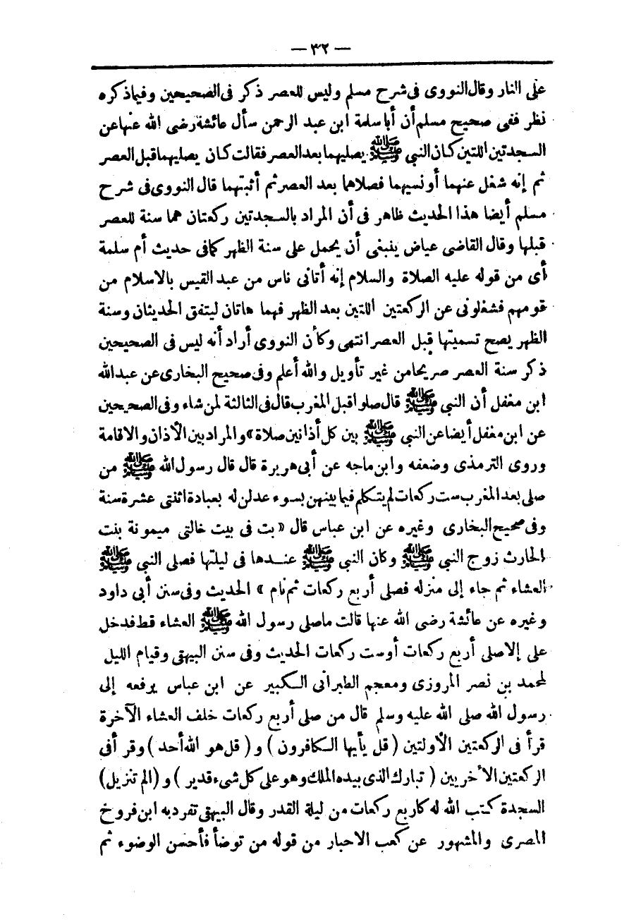 ـــــــــــــــــــــــــــــQعَلَى النَّارِ» وَقَالَ النَّوَوِيُّ فِي شَرْحِ مُسْلِمٍ وَلَيْسَ لِلْعَصْرِ ذِكْرٌ فِي الصَّحِيحَيْنِ وَفِيمَا ذَكَرَهُ نَظَرٌ فَفِي صَحِيحِ مُسْلِمٍ «أَنَّ أَبَا سَلَمَةَ بْنَ عَبْدِ الرَّحْمَنِ سَأَلَ عَائِشَةَ - رَضِيَ اللَّهُ عَنْهَا - عَنْ السَّجْدَتَيْنِ اللَّتَيْنِ كَانَ النَّبِيُّ - صَلَّى اللَّهُ عَلَيْهِ وَسَلَّمَ - يُصَلِّيهِمَا بَعْدَ الْعَصْرِ فَقَالَتْ كَانَ يُصَلِّيهِمَا قَبْلَ الْعَصْرِ ثُمَّ إنَّهُ شُغِلَ عَنْهُمَا أَوْ نَسِيَهُمَا فَصَلَّاهُمَا بَعْدَ الْعَصْرِ ثُمَّ أَثْبَتَهُمَا»