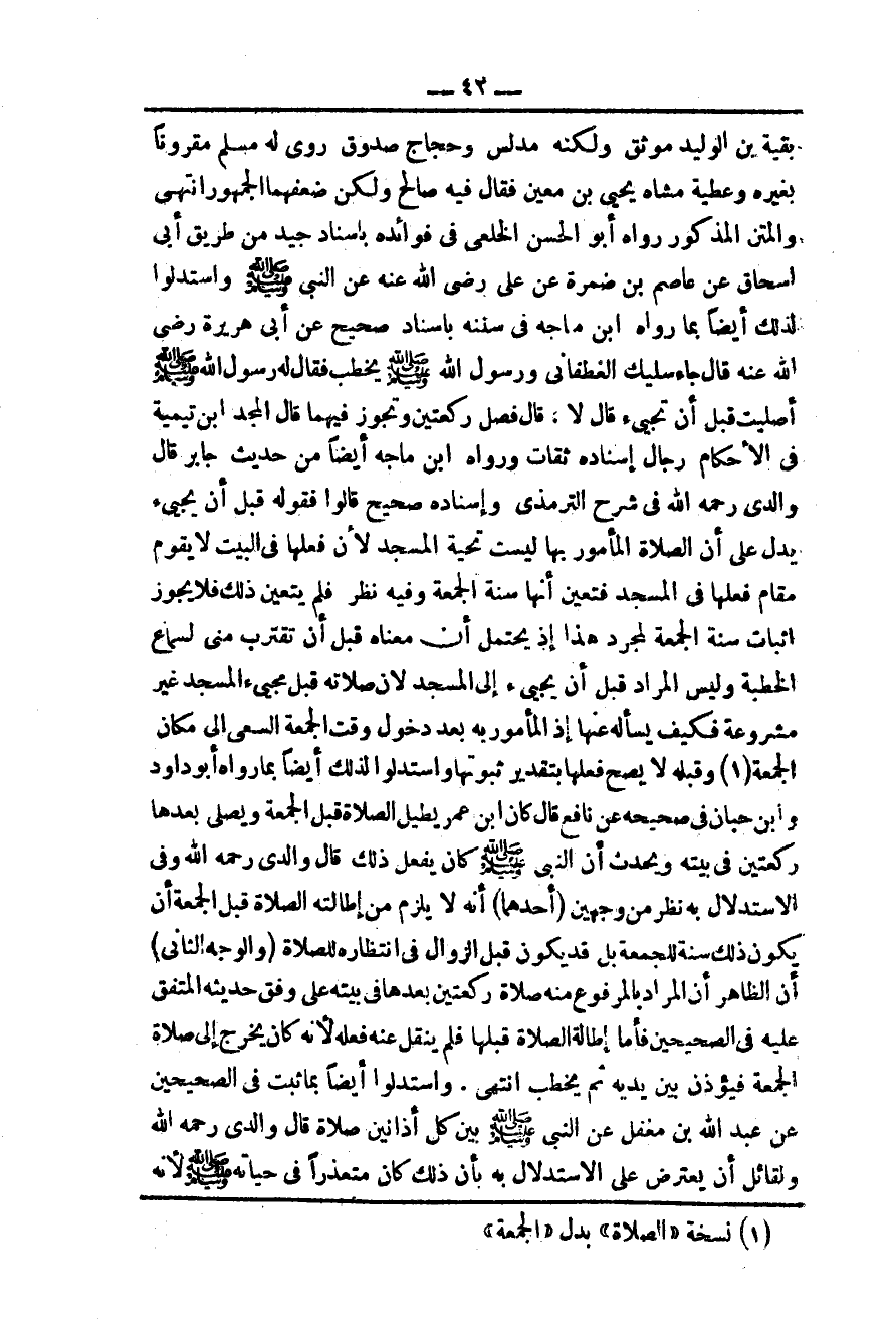ـــــــــــــــــــــــــــــQبَقِيَّةُ بْنُ الْوَلِيدِ مُوَثَّقٌ وَلَكِنَّهُ مُدَلِّسٌ وَحَجَّاجٌ صَدُوقٌ رَوَى لَهُ مُسْلِمٌ مَقْرُونًا بِغَيْرِهِ وَعَطِيَّةَ مَشَّاهُ يَحْيَى بْنُ مَعِينٍ فَقَالَ فِيهِ صَالِحٌ وَلَكِنْ ضَعَّفَهُمَا الْجُمْهُورُ انْتَهَى وَالْمَتْنُ الْمَذْكُورُ رَوَاهُ أَبُو الْحَسَنِ الْخُلَعِيِّ فِي فَوَائِدِهِ بِإِسْنَادٍ جَيِّدٍ مِنْ طَرِيقِ أَبِي إِسْحَاقَ عَنْ عَاصِمِ بْنِ ضَمْرَةَ عَنْ عَلِيٍّ - رَضِيَ اللَّهُ عَنْهُ - عَنْ النَّبِيِّ - صَلَّى اللَّهُ عَلَيْهِ وَسَلَّمَ - وَاسْتَدَلُّوا لِذَلِكَ أَيْضًا بِمَا رَوَاهُ ابْنُ مَاجَهْ فِي سُنَنِهِ بِإِسْنَادٍ صَحِيحٍ عَنْ أَبِي هُرَيْرَةَ - رَضِيَ اللَّهُ عَنْهُ - قَالَ «جَاءَ سُلَيْكٌ الْغَطَفَانِيُّ وَرَسُولُ اللَّهِ - صَلَّى اللَّهُ عَلَيْهِ وَسَلَّمَ - يَخْطُبُ فَقَالَ لَهُ رَسُولُ اللَّهِ - صَلَّى اللَّهُ عَلَيْهِ وَسَلَّمَ - أَصْلَيْت قَبْلَ أَنْ تَجِيءَ قَالَ لَا، قَالَ فَصَلِّ رَكْعَتَيْنِ وَتَجَوَّزْ فِيهِمَا» قَالَ الْمَجْدُ بْنُ تَيْمِيَّةَ فِي الْأَحْكَامِ رِجَالُ إسْنَادِهِ ثِقَاتٌ وَرَوَاهُ ابْنُ مَاجَهْ أَيْضًا مِنْ حَدِيثِ جَابِرٍ قَالَ وَالِدِي - رَحِمَهُ اللَّهُ - فِي شَرْحِ التِّرْمِذِيِّ وَإِسْنَادُهُ صَحِيحٌ قَالُوا فَقَوْلُهُ قَبْلَ أَنْ يَجِيءَ يَدُلُّ عَلَى أَنَّ الصَّلَاةَ الْمَأْمُورَ بِهَا لَيْسَتْ تَحِيَّةَ الْمَسْجِدِ لِأَنَّ فِعْلَهَا فِي الْبَيْتِ لَا يَقُومُ مَقَامَ فِعْلِهَا فِي الْمَسْجِدِ فَتَعَيَّنَ أَنَّهَا سُنَّةُ الْجُمُعَةِ.