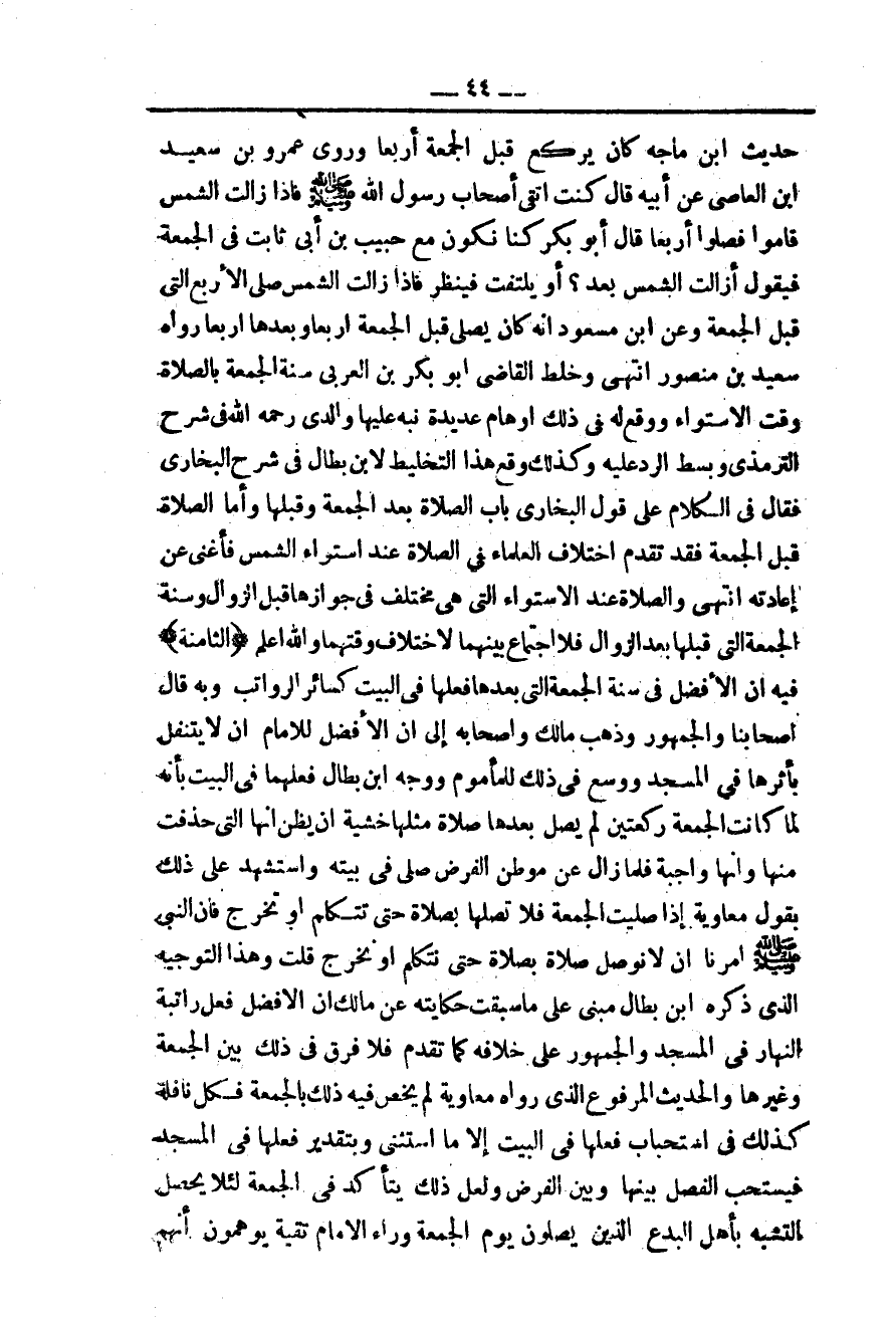 ـــــــــــــــــــــــــــــQحَدِيثَ ابْنِ مَاجَهْ «كَانَ يَرْكَعُ قَبْلَ الْجُمُعَةِ أَرْبَعًا» وَرَوَى عَمْرُو بْنُ سَعِيدِ بْنِ الْعَاصِي عَنْ أَبِيهِ قَالَ كُنْت أَتْقَى أَصْحَابِ رَسُولِ اللَّهِ - صَلَّى اللَّهُ عَلَيْهِ وَسَلَّمَ - فَإِذَا زَالَتْ الشَّمْسُ قَامُوا فَصَلَّوْا أَرْبَعًا قَالَ أَبُو بَكْرٍ كُنَّا نَكُونُ مَعَ حَبِيبِ بْنِ أَبِي ثَابِتٍ فِي الْجُمُعَةِ فَيَقُولُ أَزَالَتْ الشَّمْسُ بَعْدُ؟ أَوْ يَلْتَفِتُ فَيَنْظُرُ فَإِذَا زَالَتْ الشَّمْسُ صَلَّى الْأَرْبَعَ الَّتِي قَبْلَ الْجُمُعَةِ وَعَنْ ابْنِ مَسْعُودٍ أَنَّهُ كَانَ يُصَلِّي قَبْلَ الْجُمُعَةِ أَرْبَعًا وَبَعْدَهَا أَرْبَعًا رَوَاهُ سَعِيدُ بْنُ مَنْصُورٍ انْتَهَى.