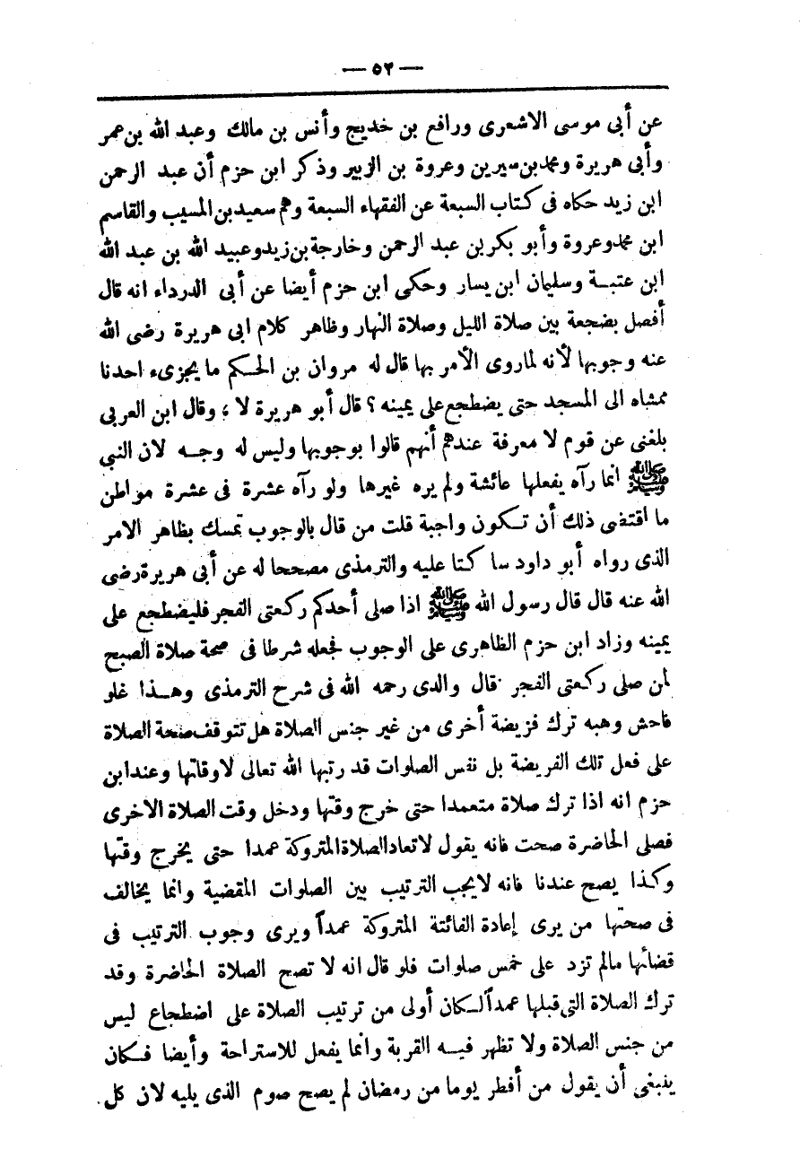 ـــــــــــــــــــــــــــــQعَنْ أَبِي مُوسَى الْأَشْعَرِيِّ وَرَافِعِ بْنِ خَدِيجٍ وَأَنَسِ بْنِ مَالِكٍ وَعَبْدِ اللَّهِ بْنِ عُمَرَ وَأَبِي هُرَيْرَةَ وَمُحَمَّدِ بْنِ سِيرِينَ وَعُرْوَةَ بْنِ الزُّبَيْرِ وَذَكَرَ ابْنُ حَزْمٍ أَنَّ عَبْدَ الرَّحْمَنِ بْنَ زَيْدٍ حَكَاهُ فِي كِتَابِ السَّبْعَةِ عَنْ الْفُقَهَاءِ السَّبْعَةِ وَهُمْ سَعِيدُ بْنُ الْمُسَيِّبِ وَالْقَاسِمُ بْنُ مُحَمَّدٍ وَعُرْوَةُ وَأَبُو بَكْرِ بْنُ عَبْدِ الرَّحْمَنِ وَخَارِجَةُ بْنُ زَيْدٍ وَعُبَيْدُ اللَّهِ بْنُ عَبْدِ اللَّهِ بْنِ عُتْبَةَ وَسُلَيْمَانُ بْنُ يَسَارٍ وَحَكَى ابْنُ حَزْمٍ أَيْضًا عَنْ أَبِي الدَّرْدَاءِ أَنَّهُ قَالَ أَفْصِلُ بِضُجَعَةٍ بَيْنَ صَلَاةِ اللَّيْلِ وَصَلَاةِ النَّهَارِ وَظَاهِرُ كَلَامِ أَبِي هُرَيْرَةَ - رَضِيَ اللَّهُ عَنْهُ - وُجُوبُهَا لِأَنَّهُ لَمَّا رَوَى الْأَمْرَ بِهَا قَالَ لَهُ مَرْوَانُ بْنُ الْحَكَمِ مَا يُجْزِئُ أَحَدَنَا مَمْشَاهُ إلَى الْمَسْجِدِ حَتَّى يَضْطَجِعَ عَلَى يَمِينِهِ؟ قَالَ أَبُو هُرَيْرَةَ لَا، وَقَالَ ابْنُ الْعَرَبِيِّ بَلَغَنِي عَنْ قَوْمٍ لَا مَعْرِفَةَ عِنْدَهُمْ أَنَّهُمْ قَالُوا بِوُجُوبِهَا وَلَيْسَ لَهُ وَجْهٌ لِأَنَّ النَّبِيَّ - صَلَّى اللَّهُ عَلَيْهِ وَسَلَّمَ - إنَّمَا رَآهُ يَفْعَلُهَا عَائِشَةُ وَلَمْ يَرَهُ غَيْرُهَا وَلَوْ رَآهُ عَشَرَةٌ فِي عَشَرَةِ مَوَاطِنَ مَا اقْتَضَى ذَلِكَ أَنْ تَكُونَ وَاجِبَةً قُلْت مَنْ قَالَ بِالْوُجُوبِ تَمَسَّكَ بِظَاهِرِ الْأَمْرِ الَّذِي رَوَاهُ أَبُو دَاوُد سَاكِتًا عَلَيْهِ وَالتِّرْمِذِيُّ مُصَحِّحًا لَهُ عَنْ أَبِي هُرَيْرَةَ - رَضِيَ اللَّهُ عَنْهُ - قَالَ قَالَ رَسُولُ اللَّهِ - صَلَّى اللَّهُ عَلَيْهِ وَسَلَّمَ - «إذَا صَلَّى أَحَدُكُمْ رَكْعَتَيْ الْفَجْرِ فَلْيَضْطَجِعْ عَلَى يَمِينِهِ» .