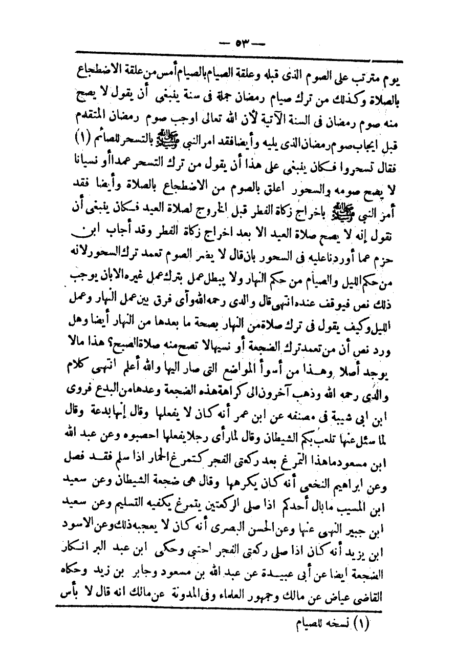ـــــــــــــــــــــــــــــQيَوْمٍ مُتَرَتِّبٌ عَلَى الصَّوْمِ الَّذِي قَبْلَهُ وَعَلَقَةُ الصِّيَامِ بِالصِّيَامِ أَمَسُّ مِنْ عَلَقَةِ الِاضْطِجَاعِ بِالصَّلَاةِ وَكَذَلِكَ مَنْ تَرَكَ صِيَامَ رَمَضَانَ جُمْلَةً فِي سَنَةٍ يَنْبَغِي أَنْ يَقُولَ لَا يَصِحُّ مِنْهُ صَوْمُ رَمَضَانَ فِي السَّنَةِ الْآتِيَةِ لِأَنَّ اللَّهَ تَعَالَى أَوْجَبَ صَوْمَ رَمَضَانَ الْمُتَقَدِّمَ قَبْلَ إيجَابِ صَوْمِ رَمَضَانَ الَّذِي يَلِيهِ وَأَيْضًا فَقَدْ «أَمَرَ النَّبِيُّ - صَلَّى اللَّهُ عَلَيْهِ وَسَلَّمَ - بِالتَّسَحُّرِ لِلصَّائِمِ فَقَالَ تَسَحَّرُوا» .