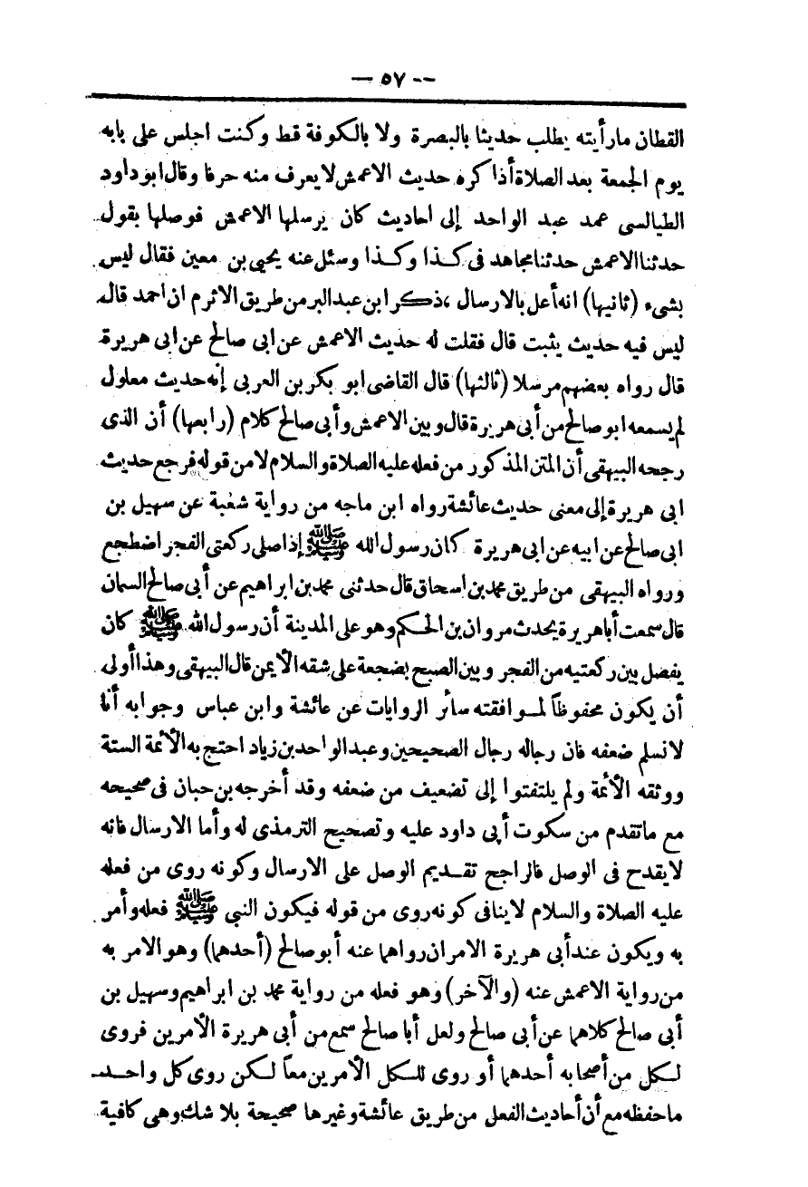 ـــــــــــــــــــــــــــــQمَا رَأَيْته يَطْلُبُ حَدِيثًا بِالْبَصْرَةِ وَلَا بِالْكُوفَةِ قَطُّ وَكُنْت أَجْلِسُ عَلَى بَابِهِ يَوْمَ الْجُمُعَةِ بَعْدَ الصَّلَاةِ أُذَاكِرُهُ حَدِيثَ الْأَعْمَشِ لَا يَعْرِفُ مِنْهُ حَرْفًا وَقَالَ أَبُو دَاوُد الطَّيَالِسِيُّ عَمَدَ عَبْدُ الْوَاحِدِ إلَى أَحَادِيثَ كَانَ يُرْسِلُهَا الْأَعْمَشُ فَوَصَلَهَا بِقَوْلِ حَدَّثَنَا الْأَعْمَشُ حَدَّثَنَا مُجَاهِدٌ فِي كَذَا وَكَذَا وَسُئِلَ عَنْهُ يَحْيَى بْنُ مَعِينٍ فَقَالَ لَيْسَ بِشَيْءٍ (ثَانِيهِمَا) إنَّهُ أُعِلَّ بِالْإِرْسَالِ، ذَكَرَ ابْنُ عَبْدِ الْبَرِّ مِنْ طَرِيقِ الْأَثْرَمِ أَنَّ أَحْمَدَ قَالَ لَيْسَ فِيهِ حَدِيثٌ يَثْبُتُ قَالَ فَقُلْت لَهُ حَدِيثُ الْأَعْمَشِ عَنْ أَبِي صَالِحٍ عَنْ أَبِي هُرَيْرَةَ قَالَ رَوَاهُ بَعْضُهُمْ مُرْسَلًا (ثَالِثُهَا) قَالَ الْقَاضِي أَبُو بَكْرِ بْنُ الْعَرَبِيِّ إنَّهُ حَدِيثٌ مَعْلُولٌ لَمْ يَسْمَعْهُ أَبُو صَالِحٍ مِنْ أَبِي هُرَيْرَةَ قَالَ وَبَيْنَ الْأَعْمَشِ وَأَبِي صَالِحٍ كَلَامٌ (رَابِعُهَا) أَنَّ الَّذِي رَجَّحَهُ الْبَيْهَقِيُّ أَنَّ الْمَتْنَ الْمَذْكُورَ مِنْ فِعْلِهِ - عَلَيْهِ الصَّلَاةُ وَالسَّلَامُ - لَا مِنْ قَوْلِهِ فَرَجَعَ حَدِيثُ أَبِي هُرَيْرَةَ إلَى مَعْنَى حَدِيثِ عَائِشَةَ رَوَاهُ ابْنُ مَاجَهْ مِنْ رِوَايَةِ شُعْبَةَ عَنْ سُهَيْلِ بْنِ أَبِي صَالِحٍ عَنْ أَبِيهِ عَنْ أَبِي هُرَيْرَةَ «كَانَ رَسُولُ اللَّهِ - صَلَّى اللَّهُ عَلَيْهِ وَسَلَّمَ - إذَا صَلَّى رَكْعَتَيْ الْفَجْرِ اضْطَجَعَ» وَرَوَاهُ الْبَيْهَقِيُّ مِنْ طَرِيقِ مُحَمَّدِ بْنِ إِسْحَاقَ قَالَ حَدَّثَنِي مُحَمَّدُ بْنُ إبْرَاهِيمَ عَنْ أَبِي صَالِحٍ السَّمَّانِ قَالَ سَمِعْت أَبَا هُرَيْرَةَ يُحَدِّثُ مَرْوَانَ بْنَ الْحَكَمِ وَهُوَ عَلَى الْمَدِينَةِ «أَنَّ رَسُولَ اللَّهِ - صَلَّى اللَّهُ عَلَيْهِ وَسَلَّمَ - كَانَ يَفْصِلُ بَيْنَ رَكْعَتَيْهِ مِنْ الْفَجْرِ وَبَيْنَ الصُّبْحِ بِضَجْعَةٍ عَلَى شِقِّهِ الْأَيْمَنِ» قَالَ الْبَيْهَقِيُّ وَهَذَا أَوْلَى أَنْ يَكُونَ مَحْفُوظًا لِمُوَافَقَتِهِ سَائِرَ الرِّوَايَاتِ عَنْ عَائِشَةَ وَابْنِ عَبَّاسٍ وَجَوَابُهُ أَنَّا لَا نُسَلِّمُ ضَعْفَهُ فَإِنَّ رِجَالَهُ رِجَالُ الصَّحِيحَيْنِ وَعَبْدُ الْوَاحِدِ بْنُ زِيَادٍ احْتَجَّ بِهِ الْأَئِمَّةُ السِّتَّةُ وَوَثَّقَهُ الْأَئِمَّةُ وَلَمْ يَلْتَفِتُوا إلَى تَضْعِيفِ مَنْ ضَعَّفَهُ وَقَدْ أَخْرَجَهُ ابْنُ حِبَّانَ فِي صَحِيحِهِ مَعَ مَا تَقَدَّمَ مِنْ سُكُوتِ أَبِي دَاوُد عَلَيْهِ وَتَصْحِيحِ التِّرْمِذِيِّ لَهُ وَأَمَّا الْإِرْسَالُ فَإِنَّهُ لَا يَقْدَحُ فِي الْوَصْلِ فَالرَّاجِحُ تَقْدِيمُ الْوَصْلِ عَلَى الْإِرْسَالِ وَكَوْنُهُ رُوِيَ مِنْ فِعْلِهِ - عَلَيْهِ الصَّلَاةُ وَالسَّلَامُ - لَا يُنَافِي كَوْنَهُ رُوِيَ مِنْ قَوْلِهِ فَيَكُونُ النَّبِيُّ - صَلَّى اللَّهُ عَلَيْهِ وَسَلَّمَ - فَعَلَهُ وَأَمَرَ بِهِ وَيَكُونُ عِنْدَ أَبِي هُرَيْرَةَ الْأَمْرَانِ رَوَاهُمَا عَنْهُ أَبُو صَالِحٍ. (أَحَدُهُمَا) وَهُوَ الْأَمْرُ بِهِ مِنْ رِوَايَةِ الْأَعْمَشِ عَنْهُ. (وَالْآخَرُ) وَهُوَ فِعْلُهُ مِنْ رِوَايَةِ مُحَمَّدِ بْنِ إبْرَاهِيمَ وَسُهَيْلِ بْنِ أَبِي صَالِحٍ كِلَاهُمَا عَنْ أَبِي صَالِحٍ وَلَعَلَّ أَبَا صَالِحٍ سَمِعَ مِنْ أَبِي هُرَيْرَةَ الْأَمْرَيْنِ فَرَوَى لِكُلٍّ مِنْ أَصْحَابِهِ أَحَدَهُمَا أَوْ رَوَى لِلْكُلِّ الْأَمْرَيْنِ مَعًا لَكِنْ رَوَى كُلُّ وَاحِدٍ مَا حَفِظَهُ مَعَ أَنَّ أَحَادِيثَ الْفِعْلِ مِنْ طَرِيقِ عَائِشَةَ وَغَيْرِهَا صَحِيحَةٌ بِلَا شَكٍّ وَهِيَ كَافِيَةٌ